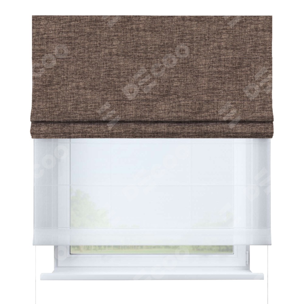 Двойная римская штора «День-ночь» от производителя Cortin предназначена для использования в проёмах. Эта штора уникальна тем, что состоит из двух полотен. На лицевой стороне находится рогожка димаут коричневый (артикул: 91018), обеспечивающий эффективное затемнение. В комплект также входит вторая ткань — легкий белый тюль (артикул: V-01), который добавляет изящества и легкости оформлению окна. Кроме того, доступны и другие разновидности ткани тюль, выбор которых доступен по  ссылке .