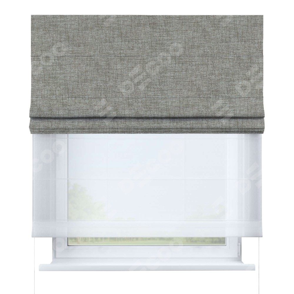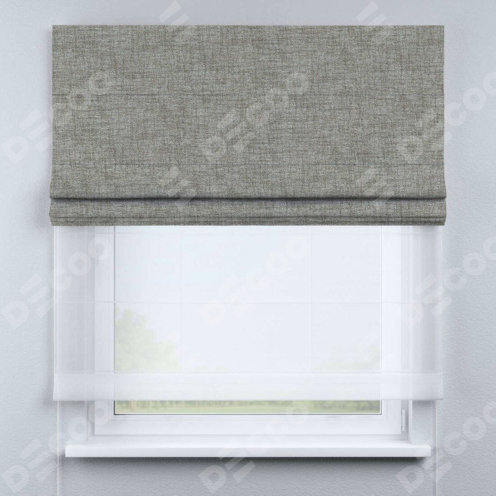 Двойная римская штора «День-ночь» от производителя Cortin предназначена для использования в проёмах. Эта штора уникальна тем, что состоит из двух полотен. На лицевой стороне находится рогожка димаут серый дуб (артикул: 91028), обеспечивающий эффективное затемнение. В комплект также входит вторая ткань — легкий белый тюль (артикул: V-01), который добавляет изящества и легкости оформлению окна. Кроме того, доступны и другие разновидности ткани тюль, выбор которых доступен по  ссылке .