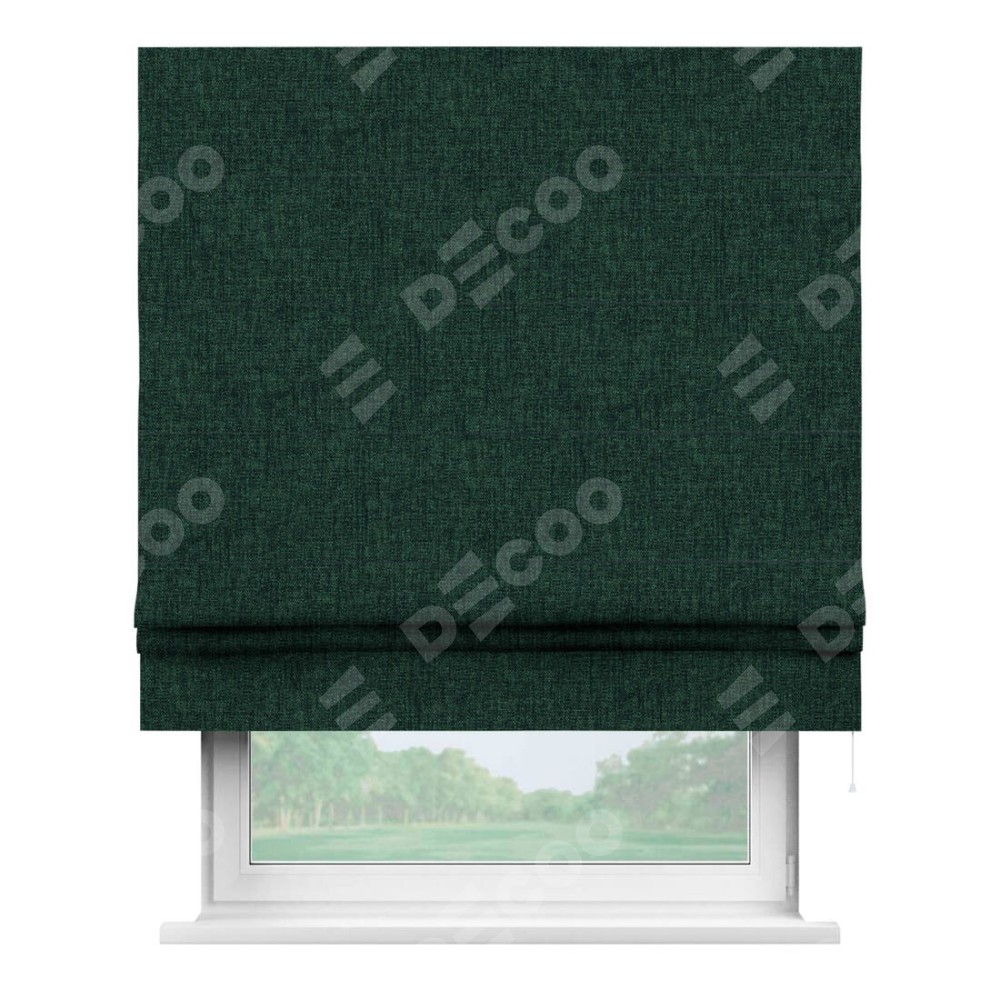 Классическая римская штора производителя «Cortin», пошита из ткани рогожка димаут тёмно-зелёный, артикул: 91022. Имеет универсальный механизм и подходит для монтажа: на потолок, на стену и в нишу.
