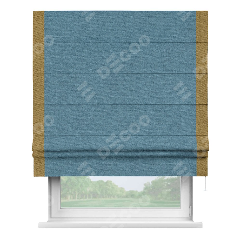 Римская штора пошита из ткани твид блэкаут светло-синий, артикул: 90935, с отделкой кантом «Стрим Дуо» выделяется наличием кантов по обоим бокам шторы, слева и справа. Этот дизайн придает шторе аккуратный и завершенный вид, акцентируя вертикальные линии и визуально вытягивая окно в высоту. Отделка кантом по бокам не только украшает штору, но и служит практической функцией, укрепляя края и продлевая срок службы изделия.