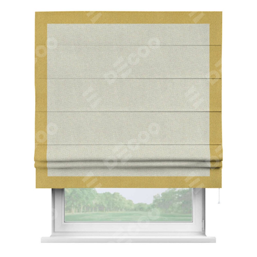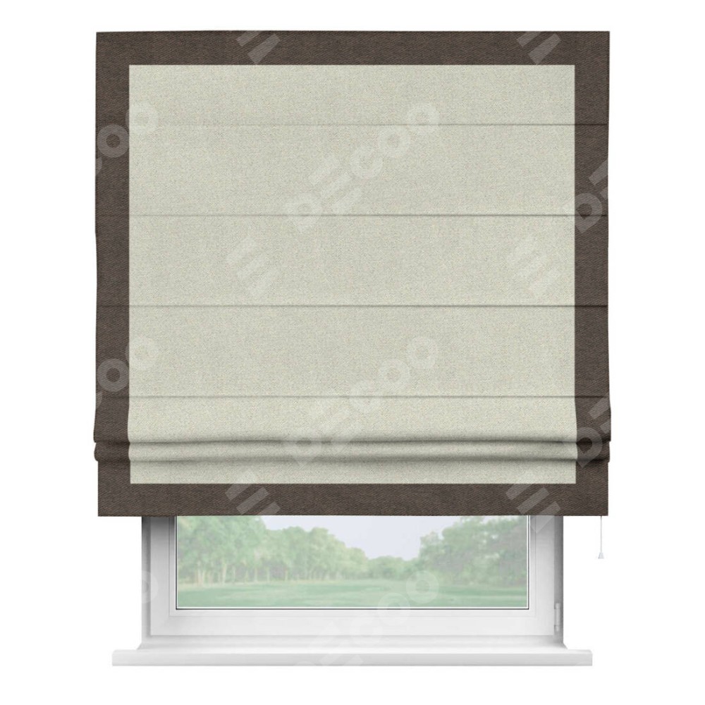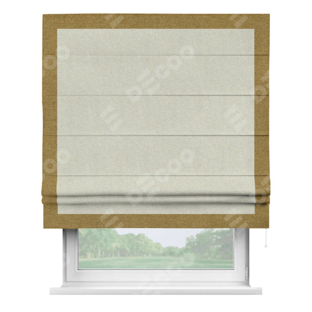 Римская штора пошита из ткани твид блэкаут шампань, артикул: 90929, с отделкой кантом «Чесс» отличается своей уникальной деталью — наличием канта не только по бокам и снизу, но и сверху по всем краям шторы. Это придает шторе особенно аккуратный и завершенный вид, делая акцент на границах и форме шторы. Отделка кантом по всему периметру шторы усиливает её декоративные качества и подчеркивает строгую геометрию, что может быть особенно актуально для современных и минималистичных интерьеров.