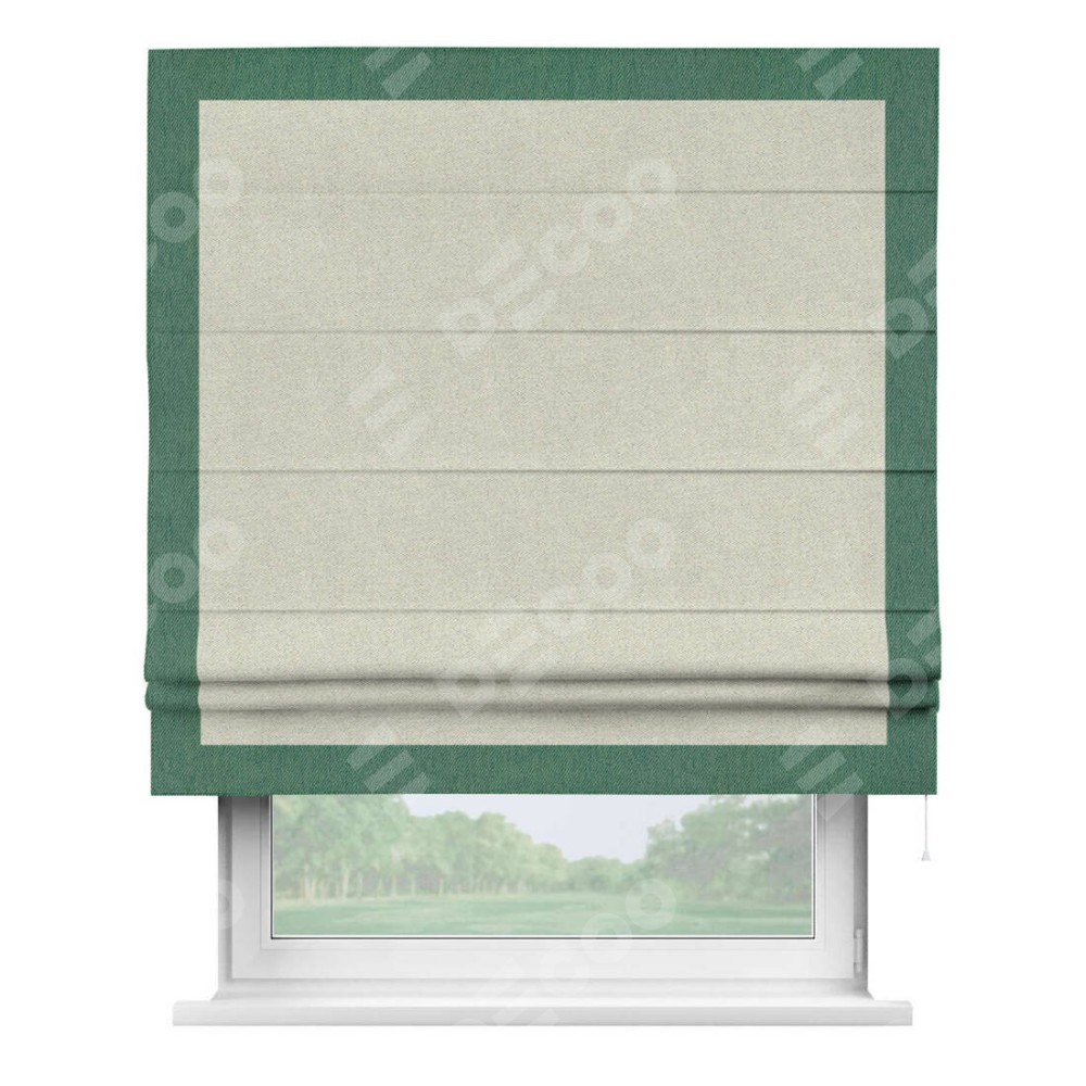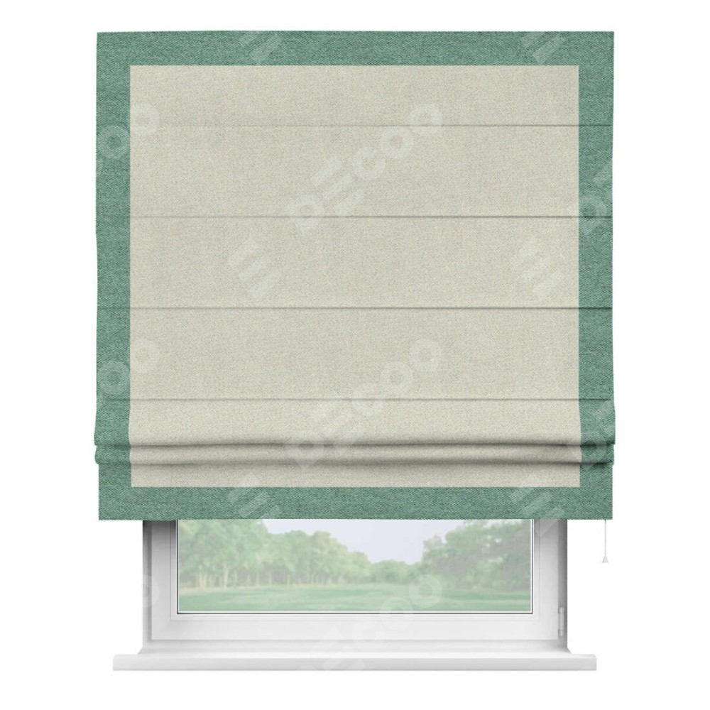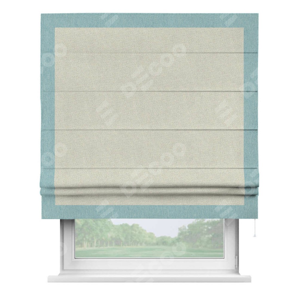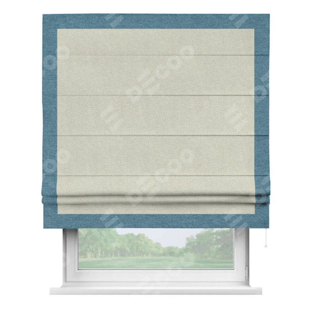 Римская штора пошита из ткани твид блэкаут шампань, артикул: 90929, с отделкой кантом «Чесс» отличается своей уникальной деталью — наличием канта не только по бокам и снизу, но и сверху по всем краям шторы. Это придает шторе особенно аккуратный и завершенный вид, делая акцент на границах и форме шторы. Отделка кантом по всему периметру шторы усиливает её декоративные качества и подчеркивает строгую геометрию, что может быть особенно актуально для современных и минималистичных интерьеров.