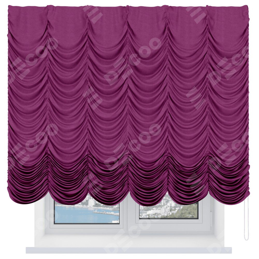 Французская штора производителя «Cortin», используется для проёма, пошита из ткани вельвет фиолетовый, артикул ткани 85552. Имеет универсальный механизм и подходит для монтажа: на потолок и на стену.