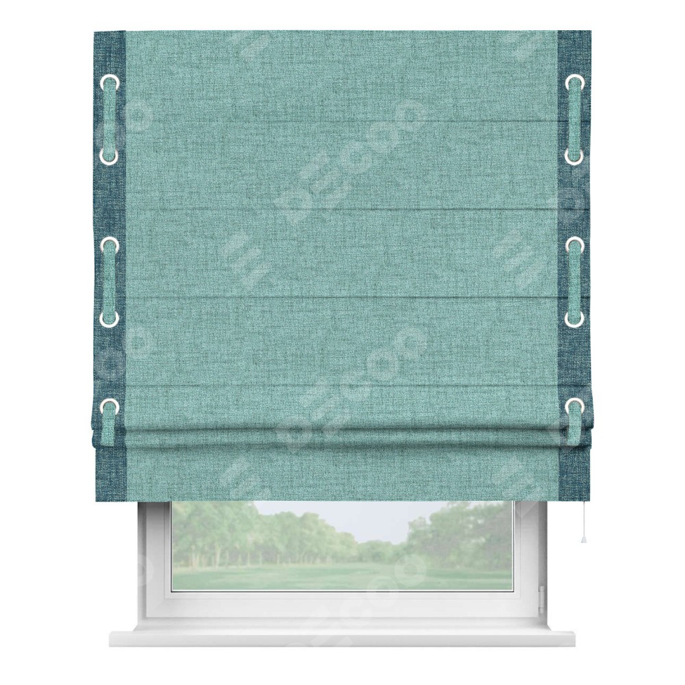 Римская штора пошита из ткани рогожка димаут аквамариновый крайола, артикул: 91023, с отделкой кантом «Стрим Дуо», дополненная декоративными люверсами на этих кантах и протянутым пояском из основного цвета римской шторы, представляет собой высоко декоративное и функциональное решение для оконного оформления. Канты, расположенные по обеим боковым сторонам шторы, уже добавляют изысканности и завершенности внешнему виду. Добавление люверсов и пояска не только усиливает декоративный эффект, но и придает шторе дополнительную текстурность и глубину.