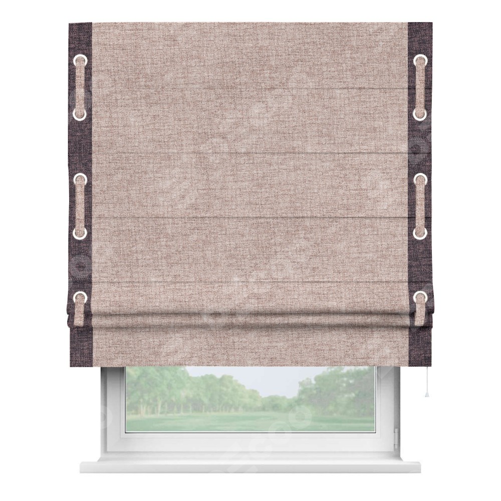Римская штора «Кортин» для проёма, рогожка димаут пыльный розовый, с кантом Стрим Дуо (люверсы с пояском)