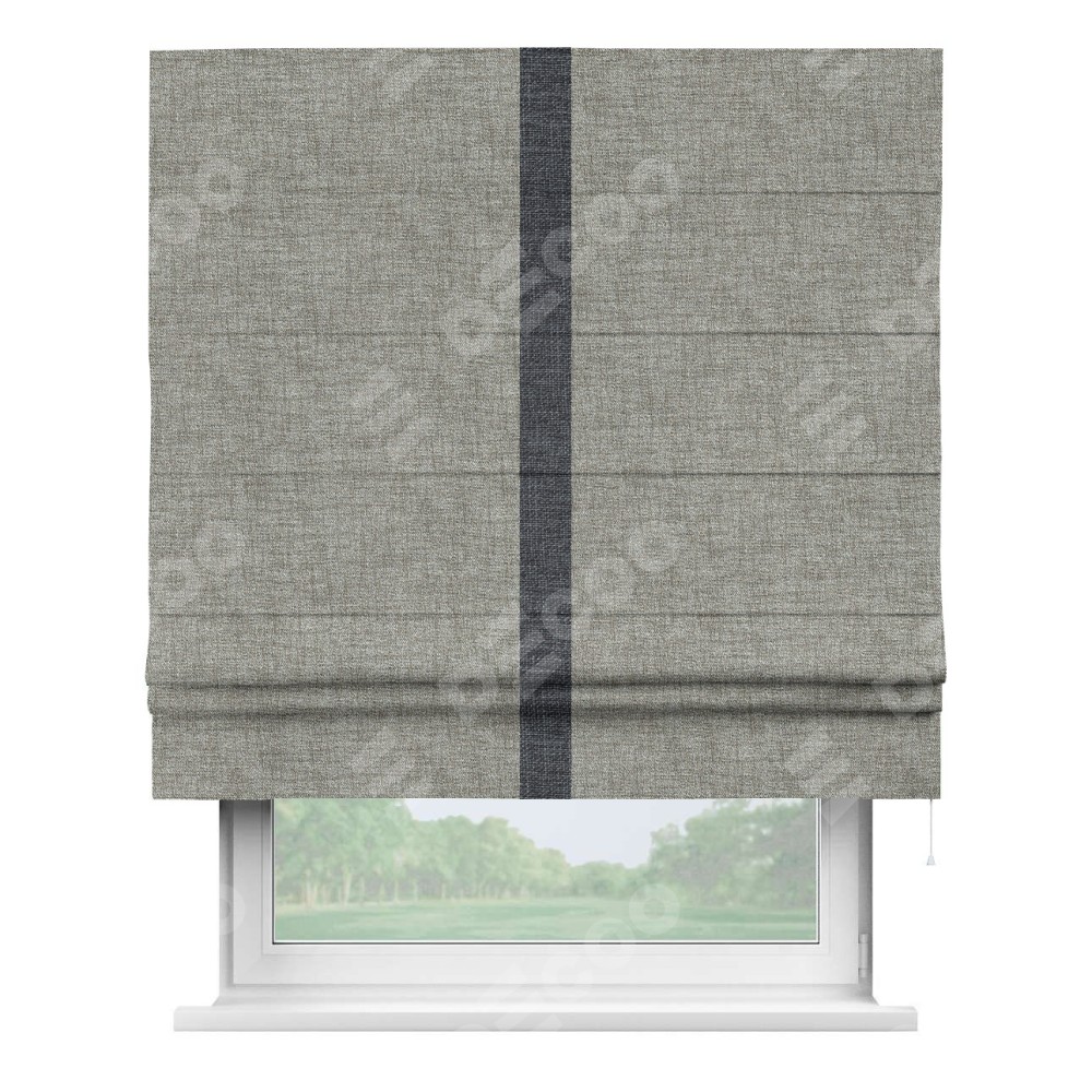Римская штора пошита из ткани рогожка димаут серый дуб, артикул: 91028, с отделкой кантом «Хайвэй» представляет собой уникальное и смелое дизайнерское решение, где кант расположен вертикально посередине шторы. Этот дизайн не только выделяет штору среди других вариантов оформления окон, но и создает интересный визуальный акцент, привлекая внимание к центру окна и разделяя штору на визуальные зоны. Такой нестандартный подход добавляет динамичности интерьеру и может быть использован для подчеркивания особенностей оформления помещения.