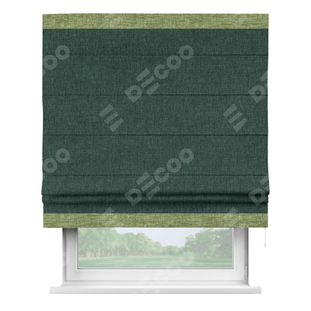 Римская штора пошита из ткани рогожка димаут тёмно-зелёный, артикул: 91022, с отделкой кантом «Горизонт» предлагает уникальное дизайнерское решение, при котором кант располагается только вверху и снизу шторы. Такое решение делает акцент на горизонтальных линиях, визуально расширяя пространство и придавая окну более строгий и организованный вид. Отделка кантом в этих ключевых местах не только украшает штору, но и способствует её долговечности, защищая наиболее уязвимые к износу края.