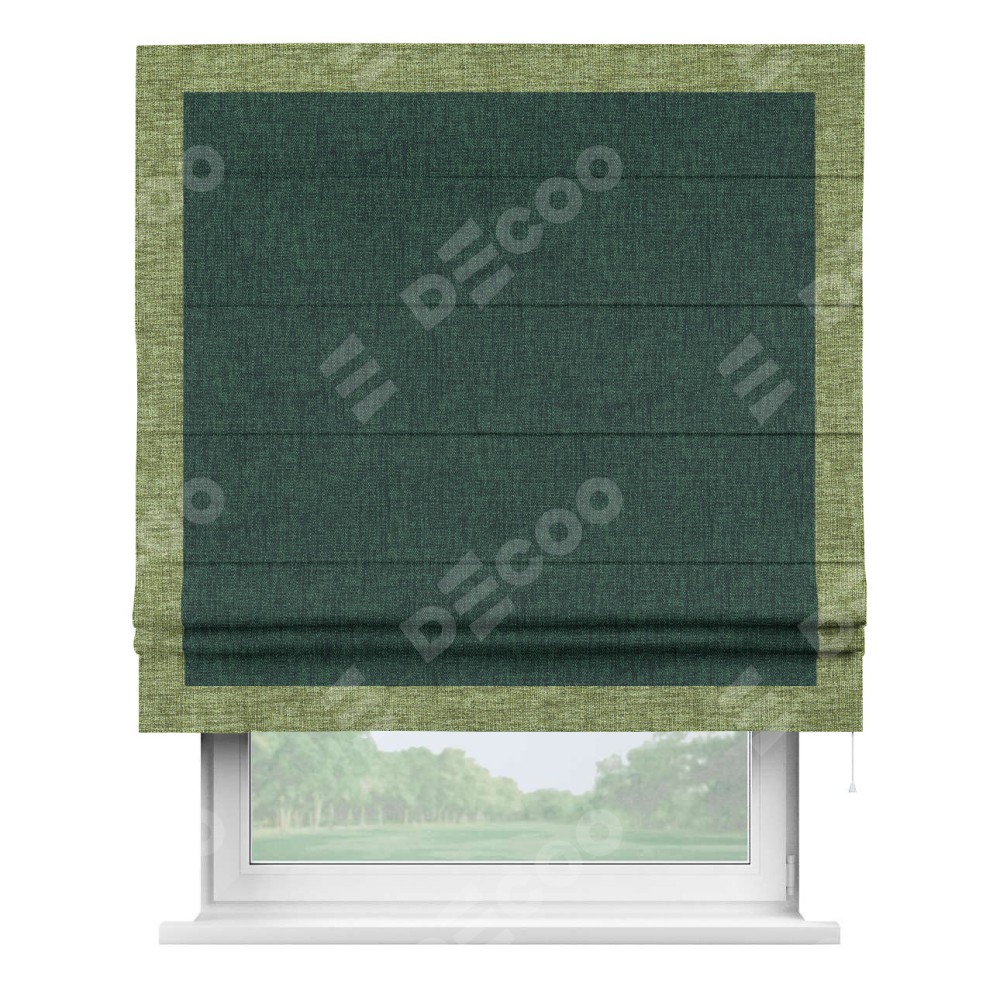 Римская штора пошита из ткани рогожка димаут тёмно-зелёный, артикул: 91022, с отделкой кантом «Чесс» отличается своей уникальной деталью — наличием канта не только по бокам и снизу, но и сверху по всем краям шторы. Это придает шторе особенно аккуратный и завершенный вид, делая акцент на границах и форме шторы. Отделка кантом по всему периметру шторы усиливает её декоративные качества и подчеркивает строгую геометрию, что может быть особенно актуально для современных и минималистичных интерьеров.