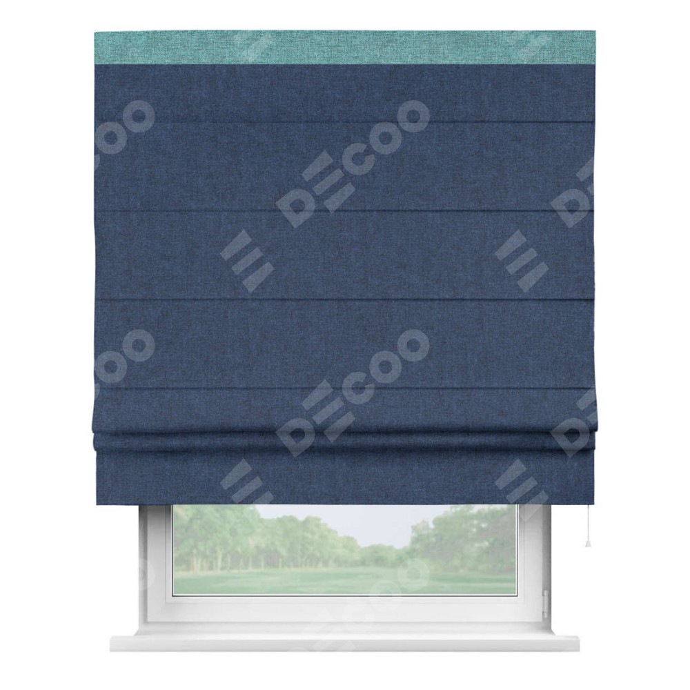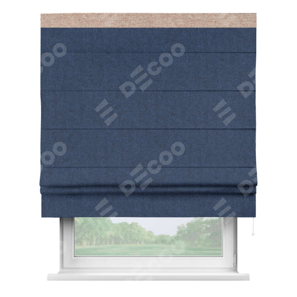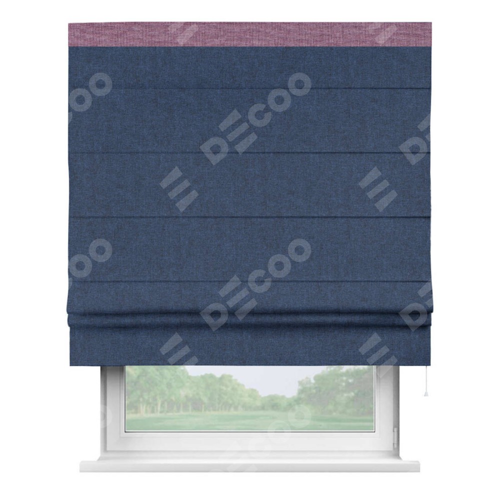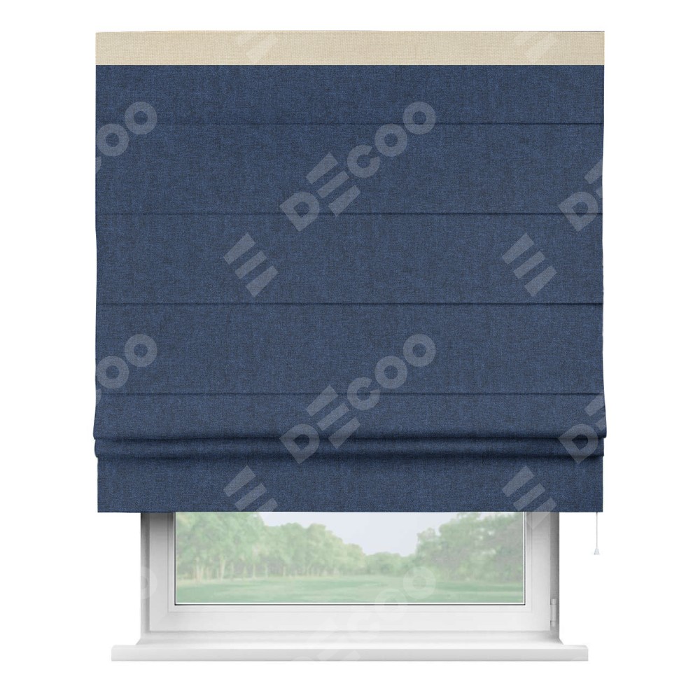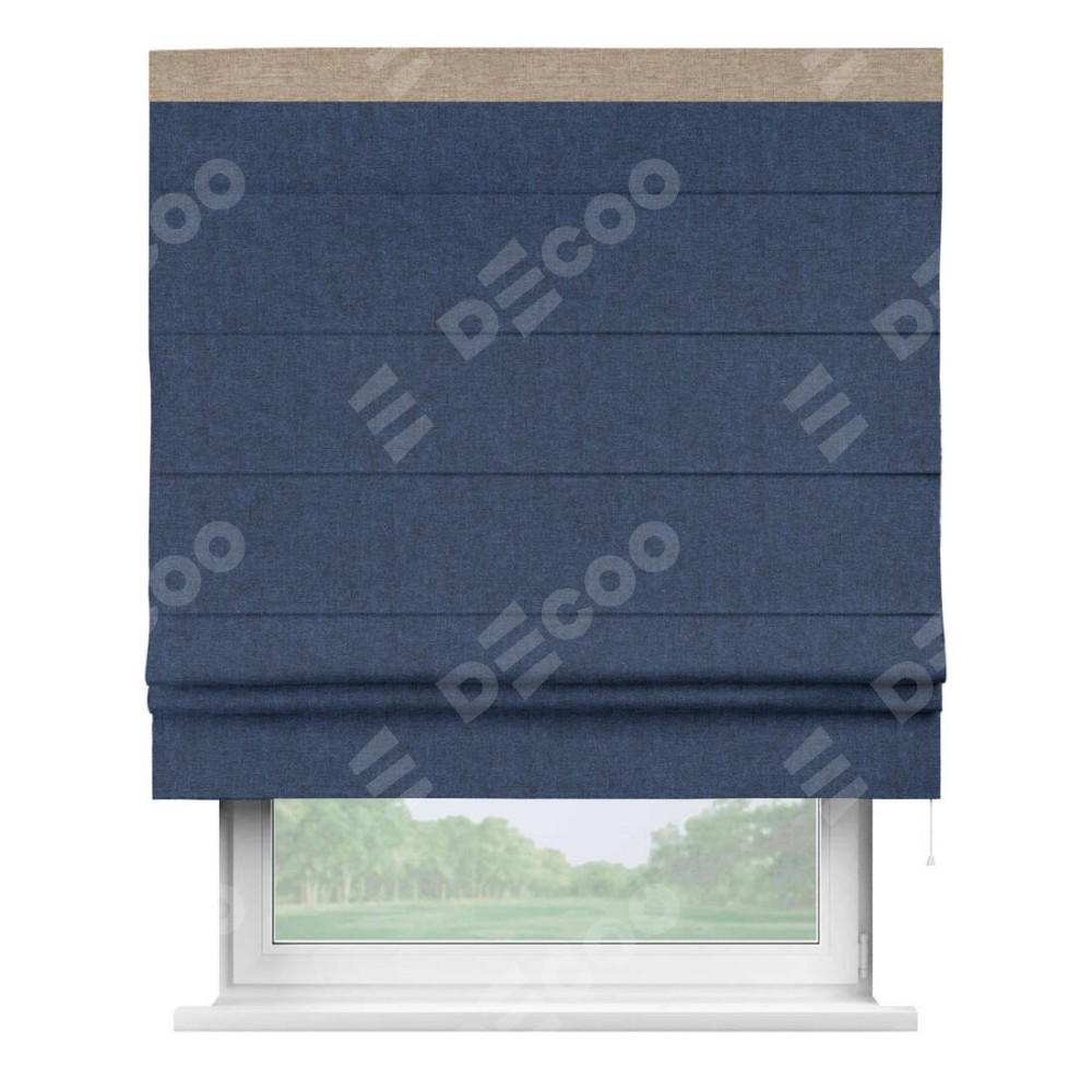 Римская штора пошита из ткани лён кашемир тёмно-синий, артикул: 17215, с отделкой кантом «Кинг» отличается своей необычной особенностью: кант располагается исключительно сверху шторы. Такой дизайн делает акцент на верхней части окна, визуально поднимая потолок и придавая интерьеру более возвышенный и изысканный вид. Отделка кантом на верхней кромке не только украшает штору, но и может служить дополнительной защитой от износа в месте наибольшего контакта с механизмом управления шторой.