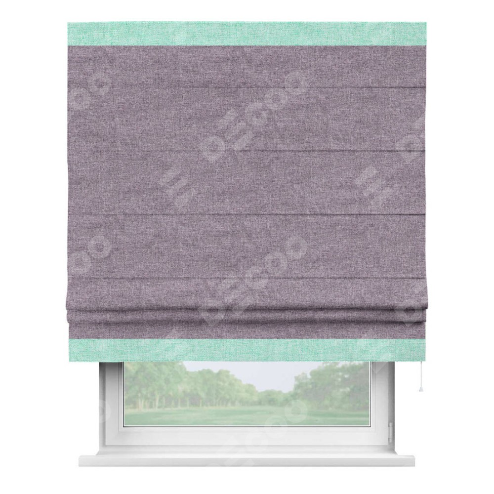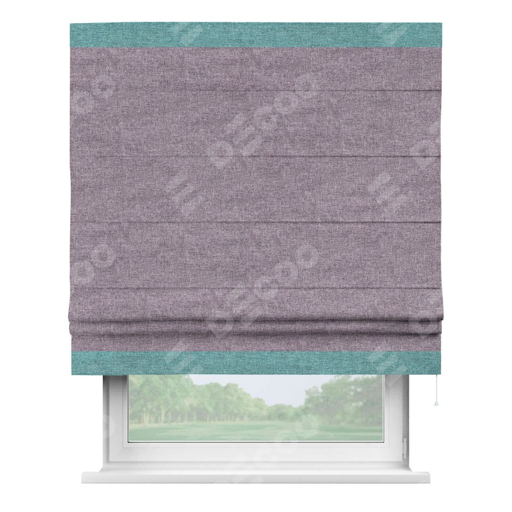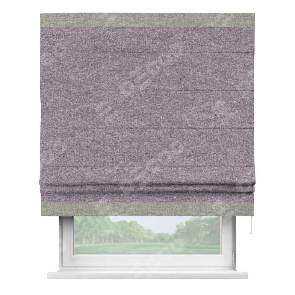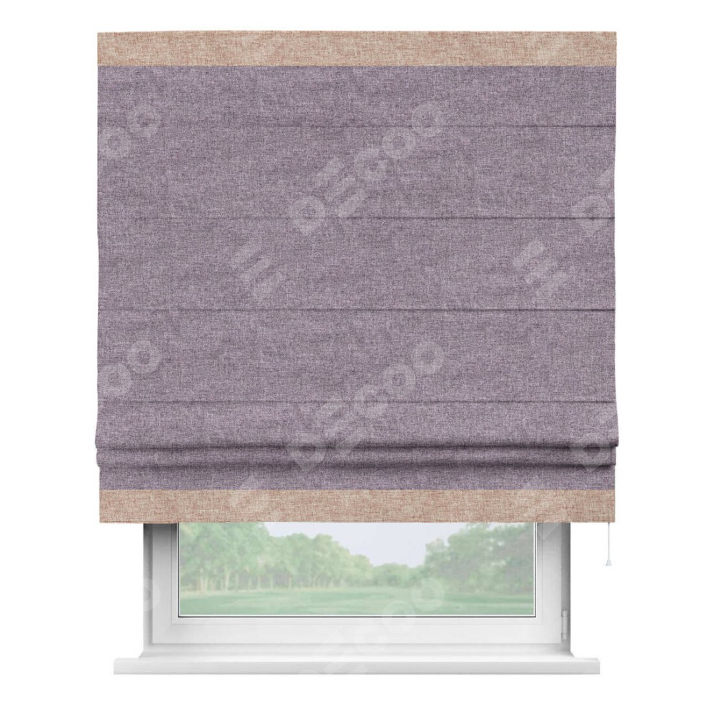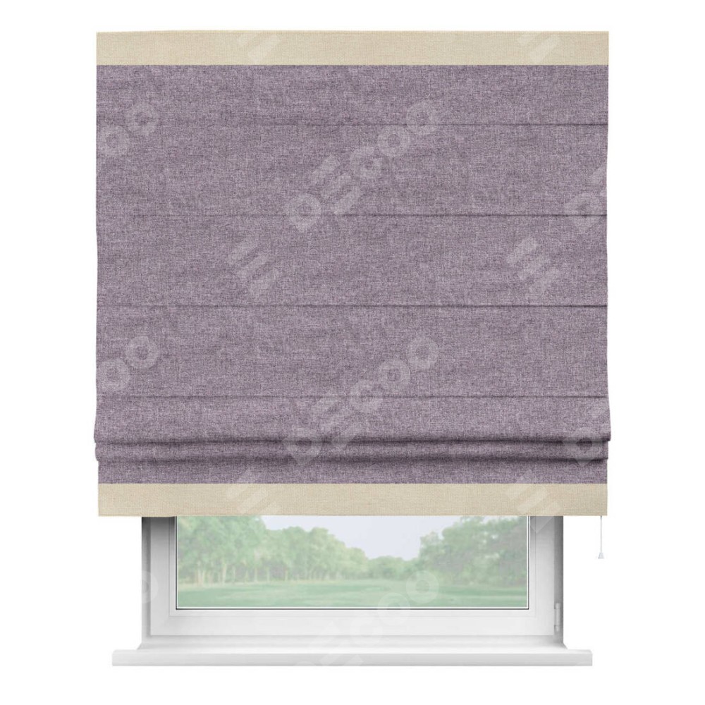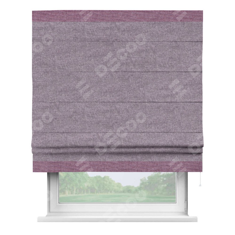 Римская штора пошита из ткани лён кашемир фиолетовый, артикул: 17211, с отделкой кантом «Горизонт» предлагает уникальное дизайнерское решение, при котором кант располагается только вверху и снизу шторы. Такое решение делает акцент на горизонтальных линиях, визуально расширяя пространство и придавая окну более строгий и организованный вид. Отделка кантом в этих ключевых местах не только украшает штору, но и способствует её долговечности, защищая наиболее уязвимые к износу края.