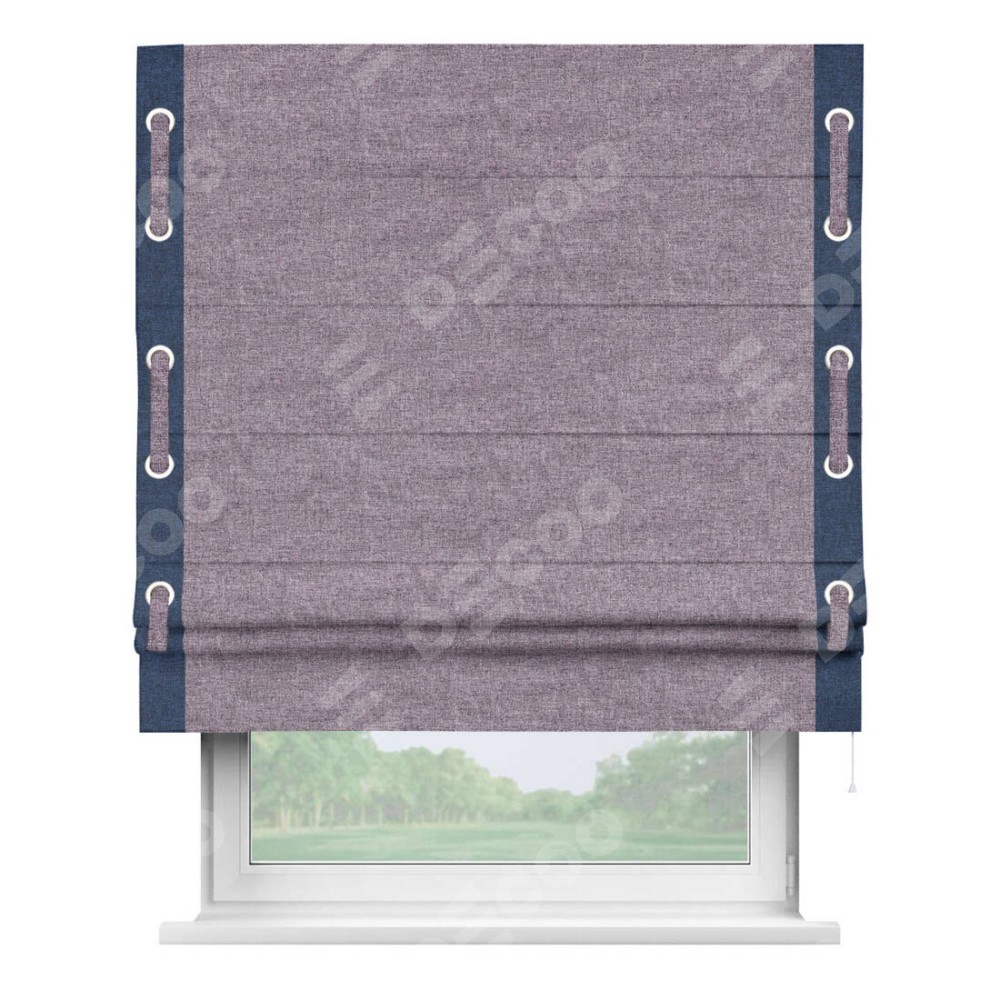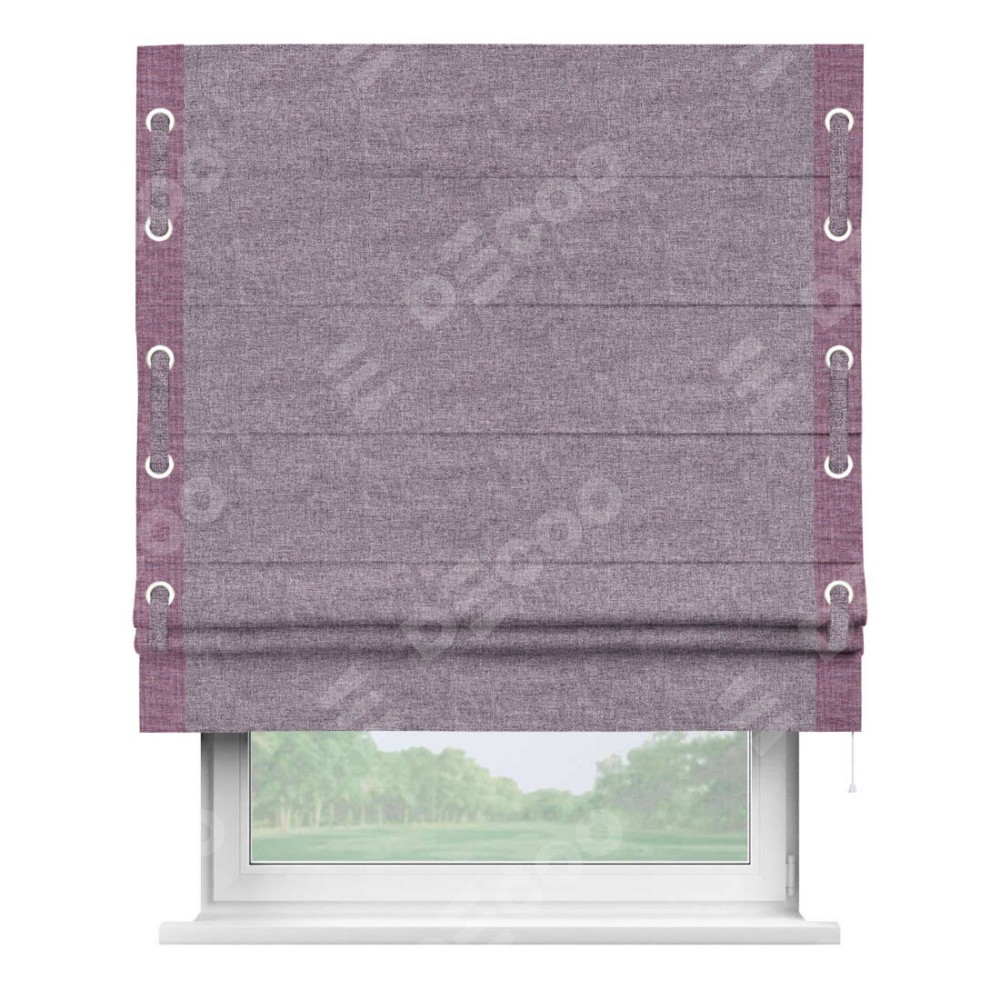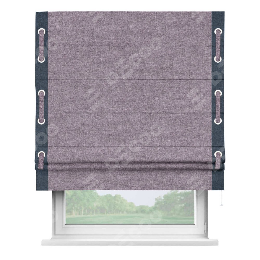 Римская штора «Кортин» для проёма, лён кашемир фиолетовый, с кантом Стрим Дуо (люверсы с пояском)