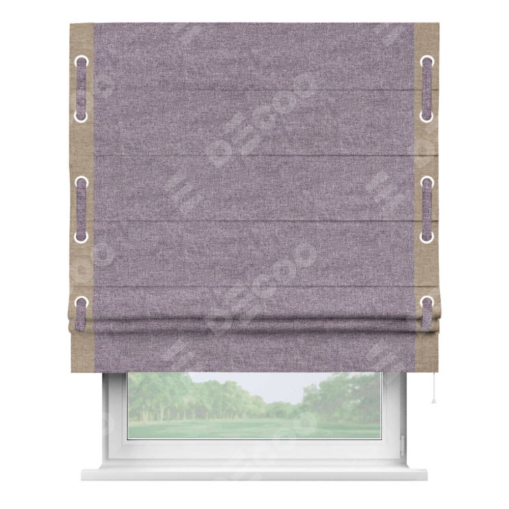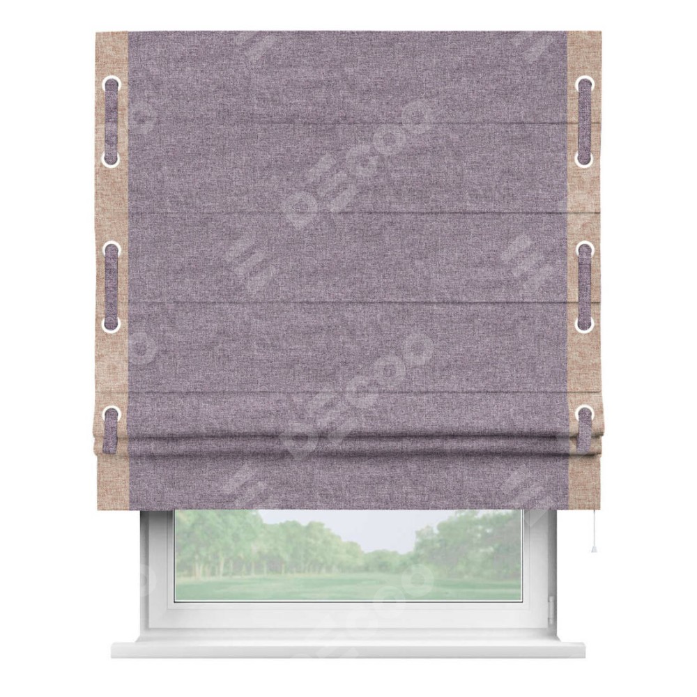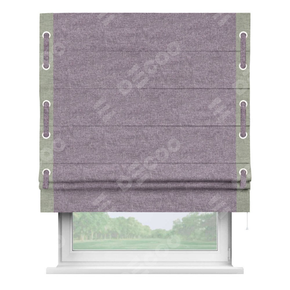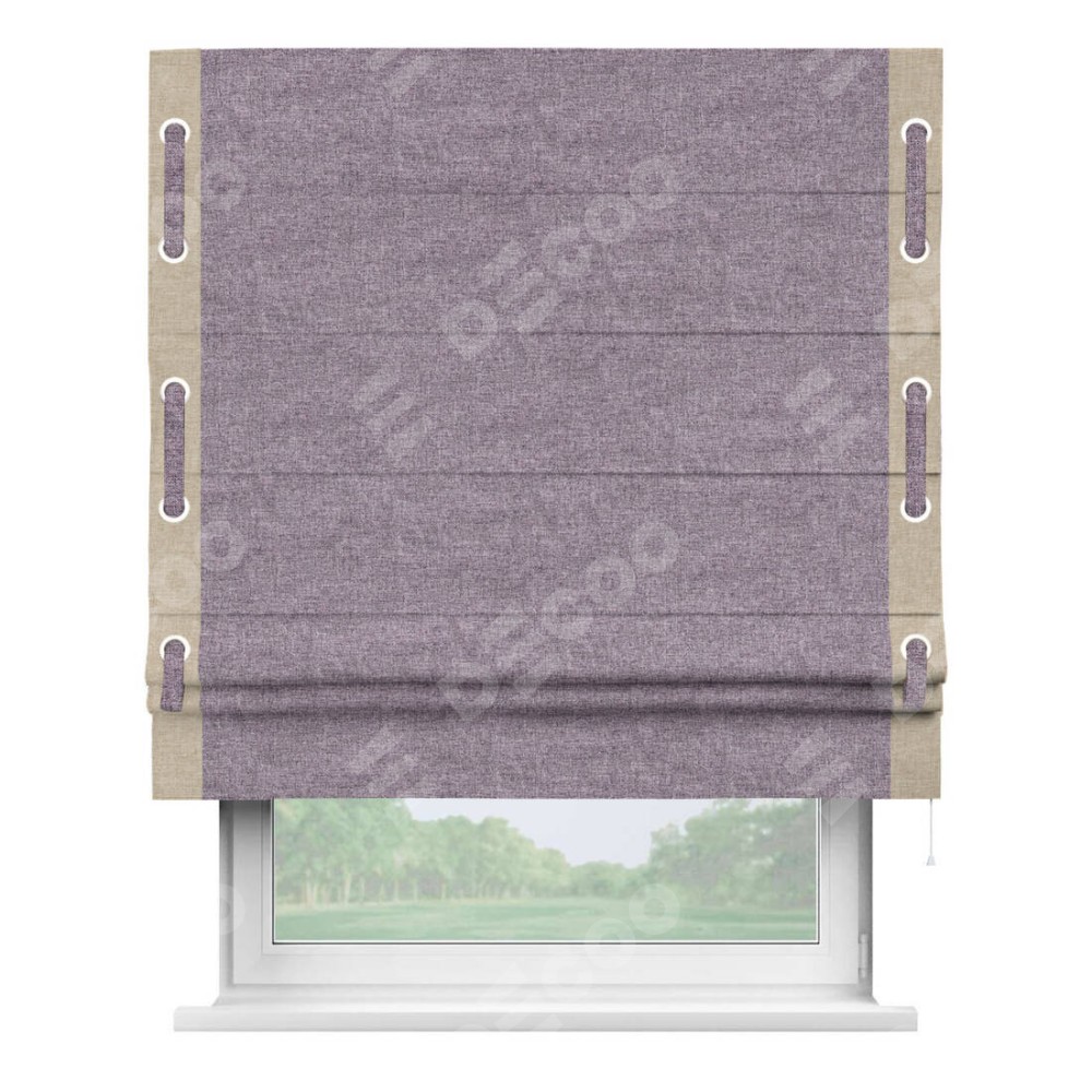 Римская штора «Кортин» для проёма, лён кашемир фиолетовый, с кантом Стрим Дуо (люверсы с пояском)