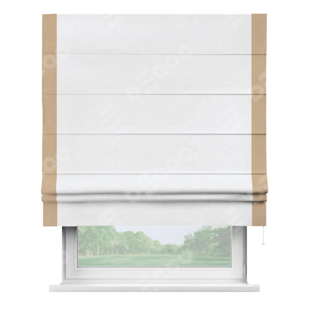 Римская штора пошита из ткани вельвет белоснежный, артикул: 92698, с отделкой кантом «Стрим Дуо» выделяется наличием кантов по обоим бокам шторы, слева и справа. Этот дизайн придает шторе аккуратный и завершенный вид, акцентируя вертикальные линии и визуально вытягивая окно в высоту. Отделка кантом по бокам не только украшает штору, но и служит практической функцией, укрепляя края и продлевая срок службы изделия.