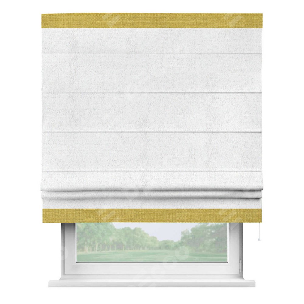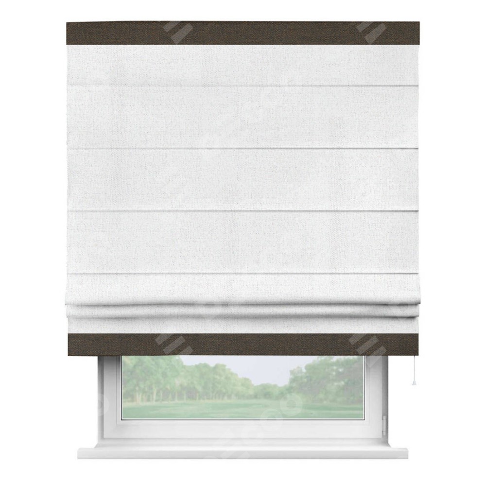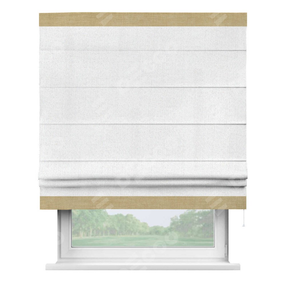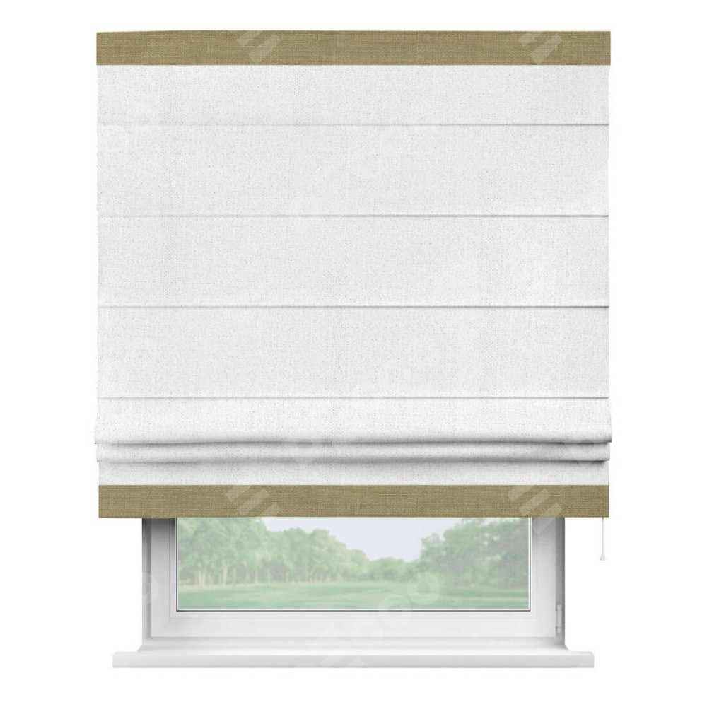 Римская штора пошита из ткани лён белоснежный, артикул: 95632, с отделкой кантом «Горизонт» предлагает уникальное дизайнерское решение, при котором кант располагается только вверху и снизу шторы. Такое решение делает акцент на горизонтальных линиях, визуально расширяя пространство и придавая окну более строгий и организованный вид. Отделка кантом в этих ключевых местах не только украшает штору, но и способствует её долговечности, защищая наиболее уязвимые к износу края.