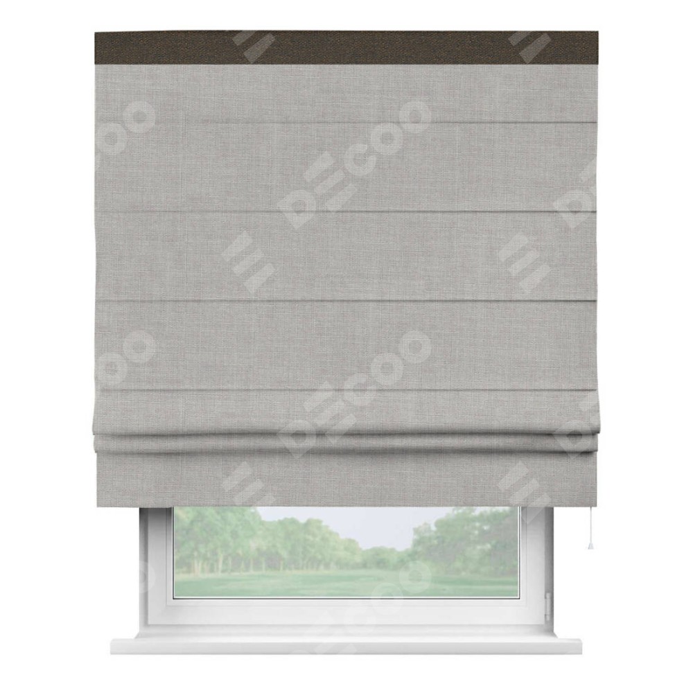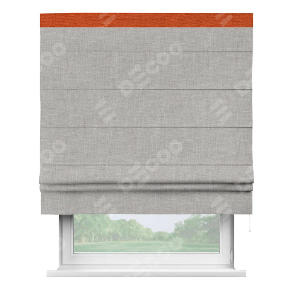 Римская штора пошита из ткани лён серый, артикул: 91410, с отделкой кантом «Кинг» отличается своей необычной особенностью: кант располагается исключительно сверху шторы. Такой дизайн делает акцент на верхней части окна, визуально поднимая потолок и придавая интерьеру более возвышенный и изысканный вид. Отделка кантом на верхней кромке не только украшает штору, но и может служить дополнительной защитой от износа в месте наибольшего контакта с механизмом управления шторой.