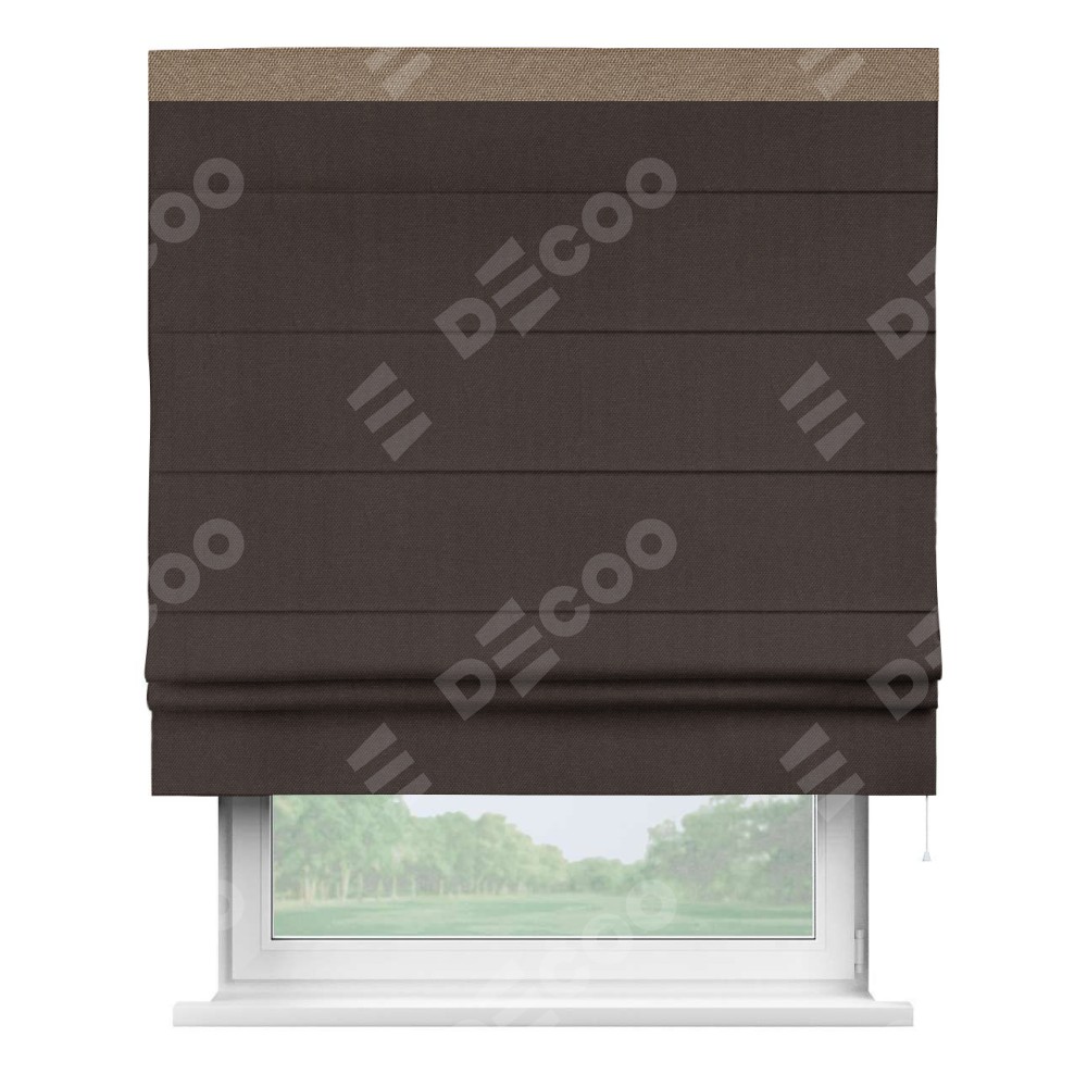 Римская штора пошита из ткани лён димаут венге, артикул: 91001, с отделкой кантом «Кинг» отличается своей необычной особенностью: кант располагается исключительно сверху шторы. Такой дизайн делает акцент на верхней части окна, визуально поднимая потолок и придавая интерьеру более возвышенный и изысканный вид. Отделка кантом на верхней кромке не только украшает штору, но и может служить дополнительной защитой от износа в месте наибольшего контакта с механизмом управления шторой.