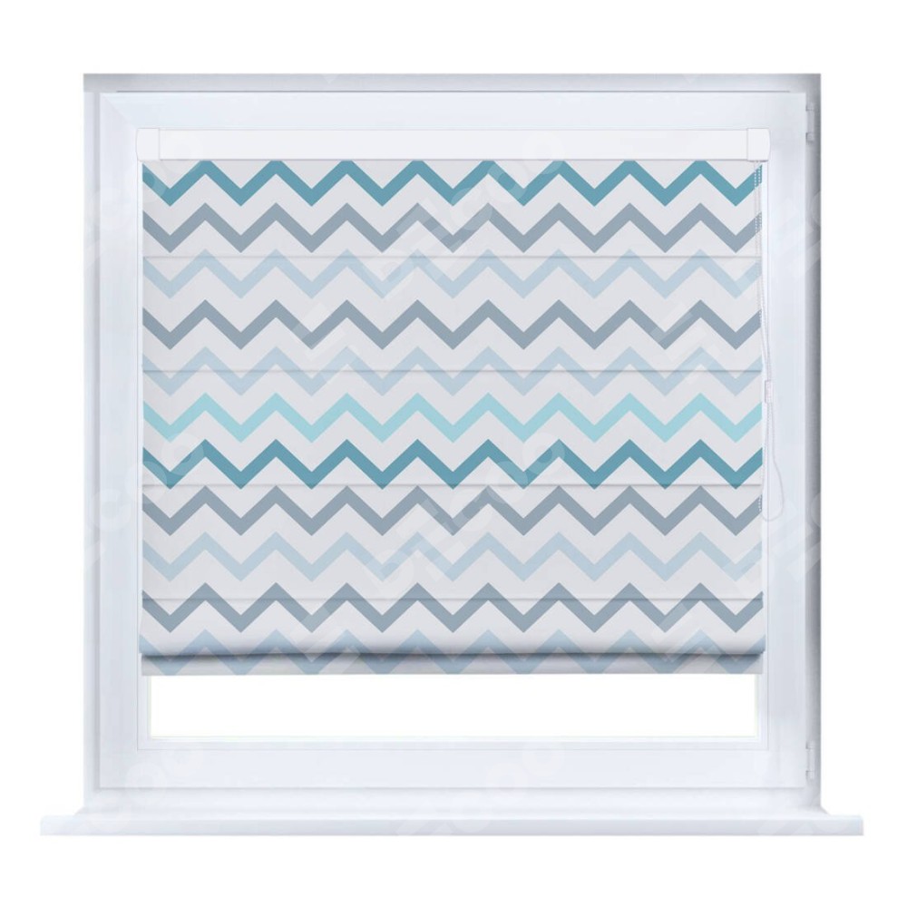 Римская штора производителя «Cortin», устанавливается на створку окна, пошита из ткани блэкаут с нанесением сублимационной печати «Небесный шеврон». Штора шьётся по индивидуальным размерам, для данного типа римской шторы возможная ширина от 35 до 150 см., высота до 250 см.