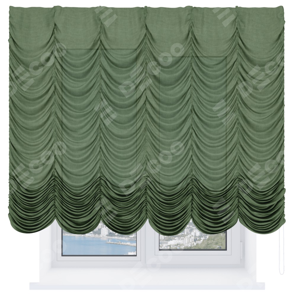 Французская штора производителя «Cortin», используется для проёма, пошита из ткани лён зелёный, артикул ткани 131547. Имеет универсальный механизм и подходит для монтажа: на потолок и на стену.