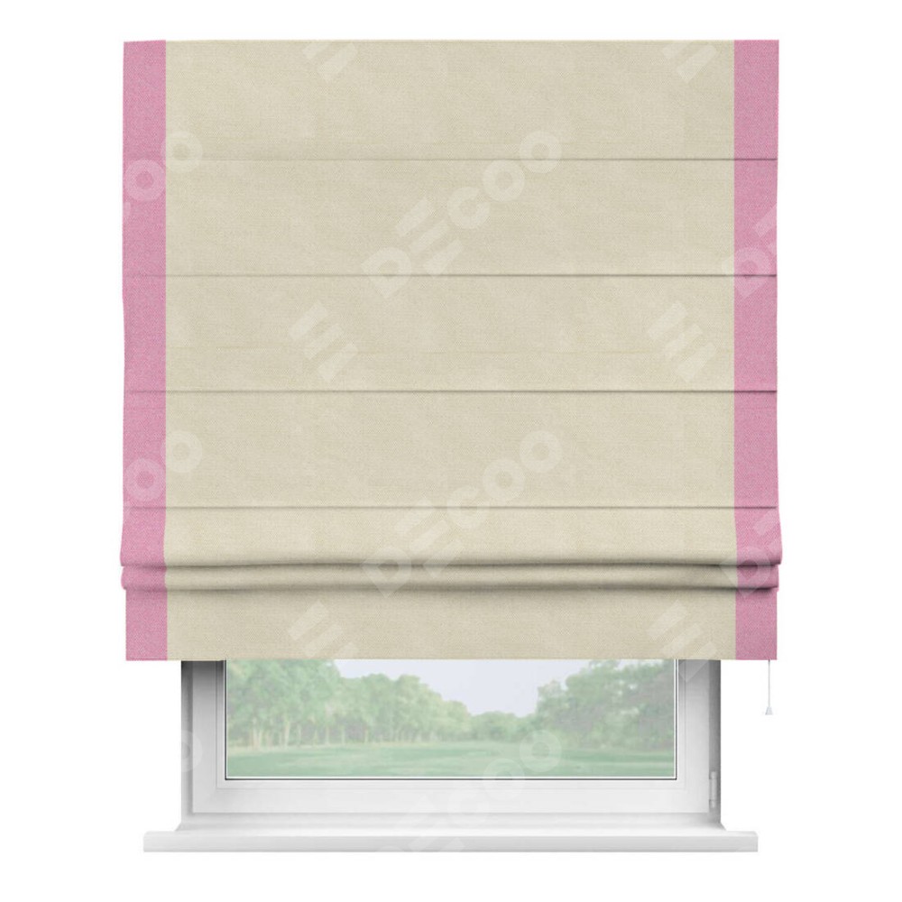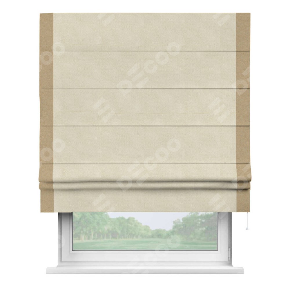 Римская штора производителя «Cortin», используется для проёма, пошита из ткани лён димаут бежевый, артикул 83023. Отделка шторы кантом «Стрим Дуо», ткань для канта используется из льна димаут разной расцветки на выбор. Имеет универсальный механизм и подходит для монтажа: на потолок, на стену и в нишу.