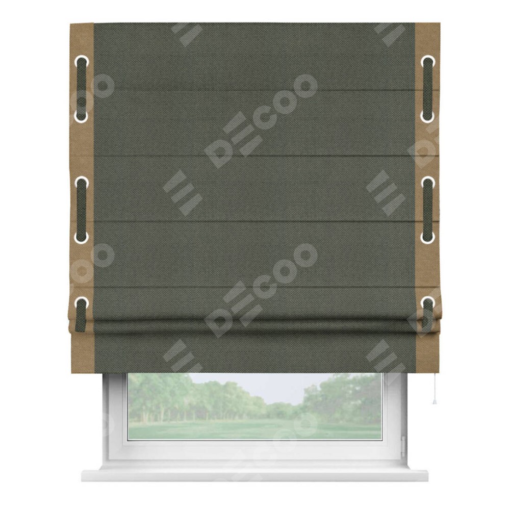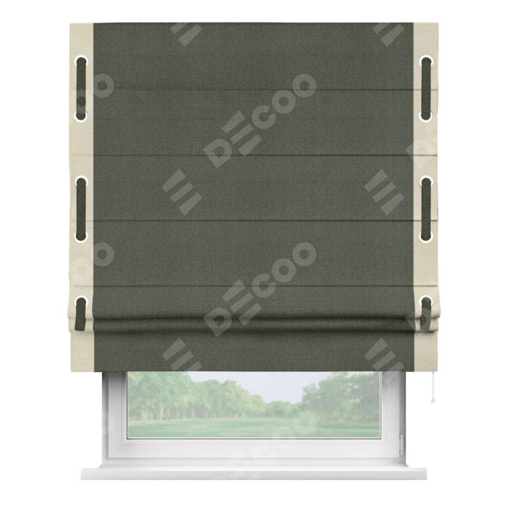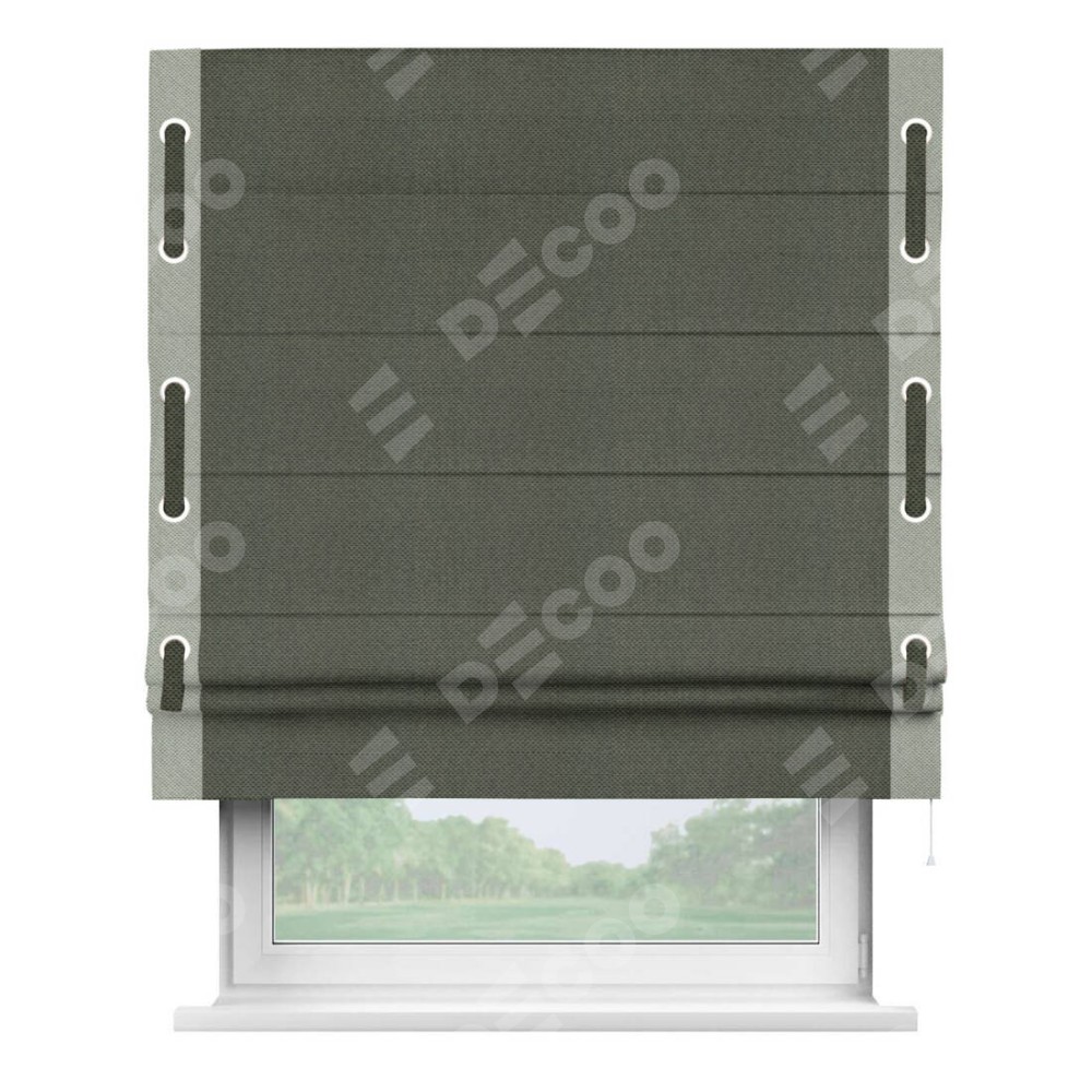 Римская штора производителя «Cortin», используется для проёма, пошита из ткани лён димаут графит, артикул 27. Отделка шторы кантом «Стрим Дуо» на кантах расположены люверсы с пояском, ткань для канта используется лён димаут разной расцветки на выбор. Ткань для пояска обычно используется из основной ткани шторы, а так же можно сделать из любой расцветки по желанию. Имеет универсальный механизм и подходит для монтажа: на потолок, на стену и в нишу.