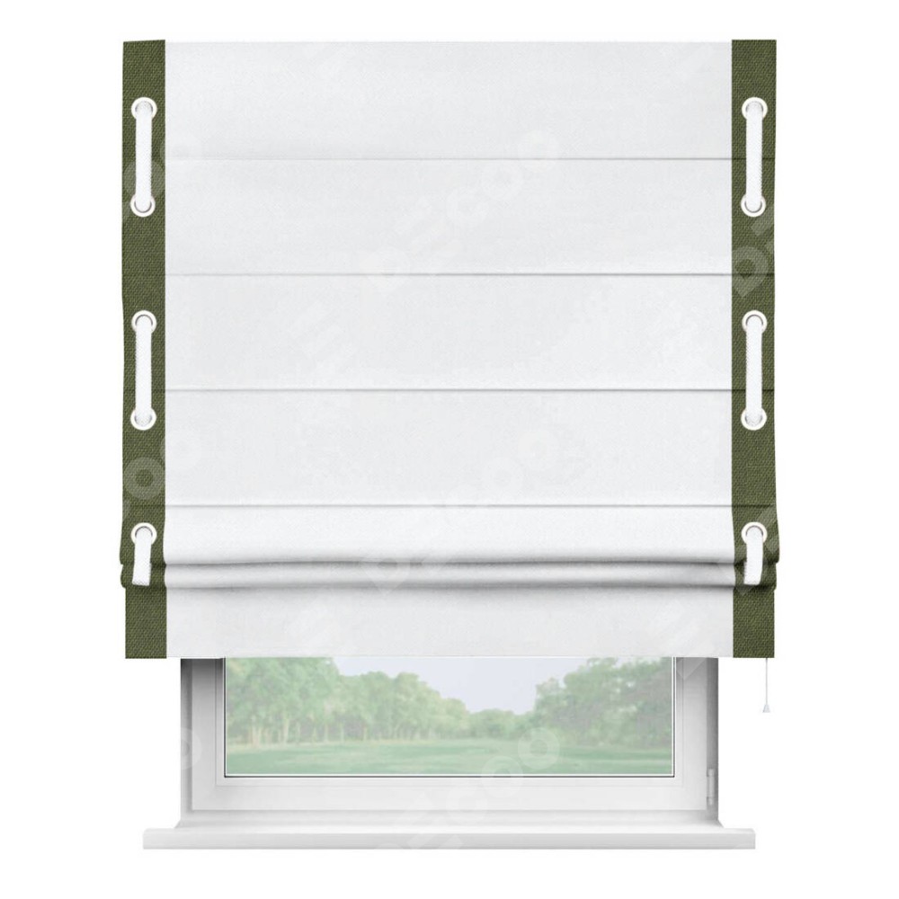 Римская штора «Кортин» для проема, лён димаут белый с кантом Стрим Дуо (люверсы с пояском)
