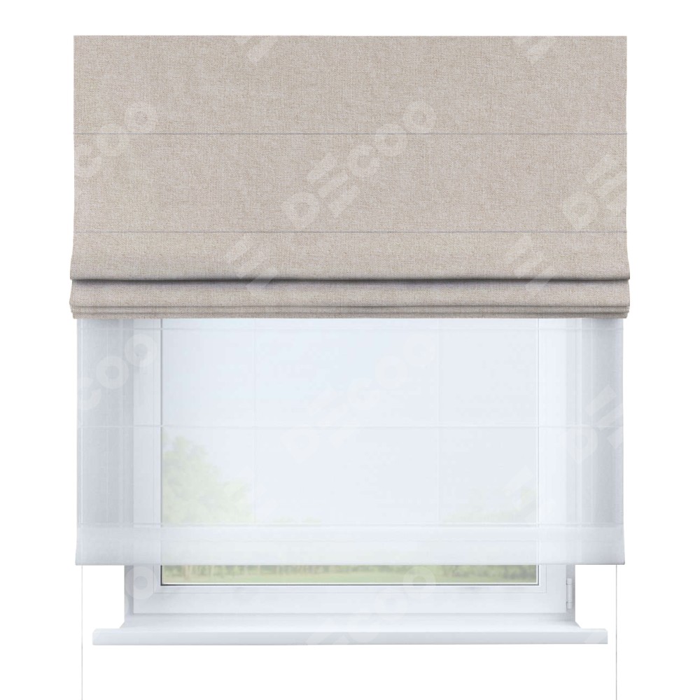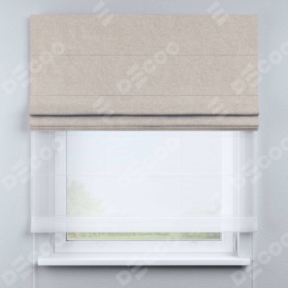 Двойная римская штора «День-ночь» от производителя Cortin предназначена для использования в проёмах. Эта штора уникальна тем, что состоит из двух полотен. На лицевой стороне находится лён кашемир натуральный беж (артикул: bej), обеспечивающий эффективное затемнение. В комплект также входит вторая ткань — легкий белый тюль (артикул: V-01), который добавляет изящества и легкости оформлению окна. Кроме того, доступны и другие разновидности ткани тюль, выбор которых доступен по ссылке .