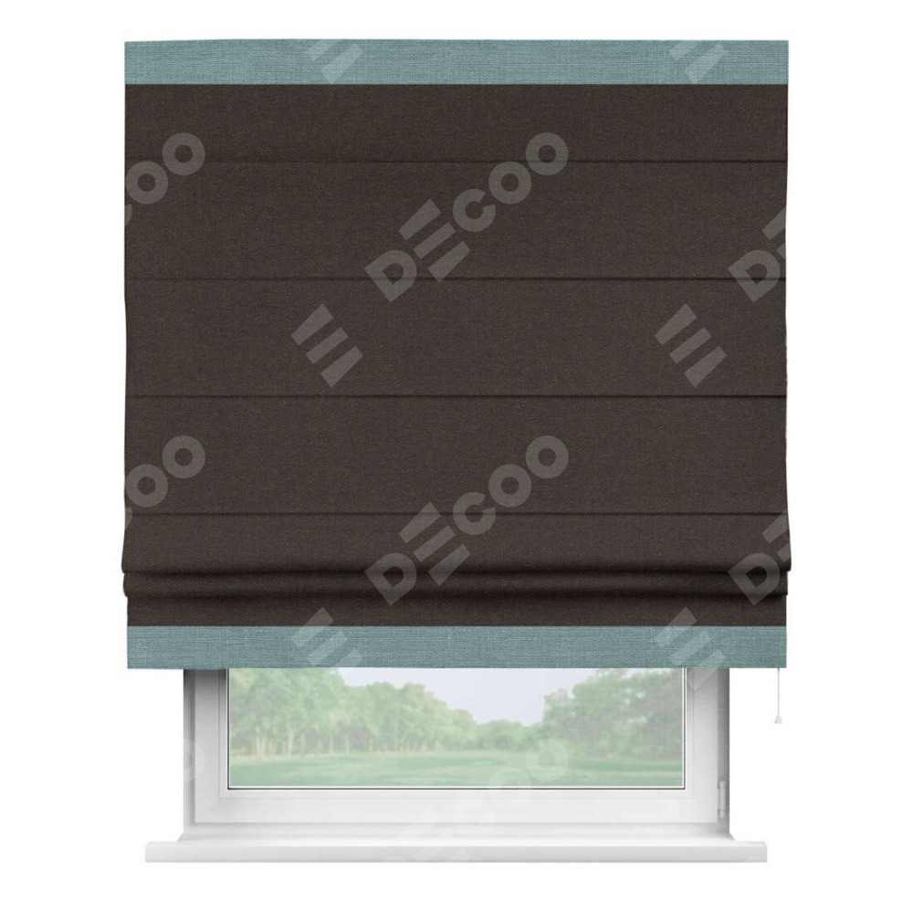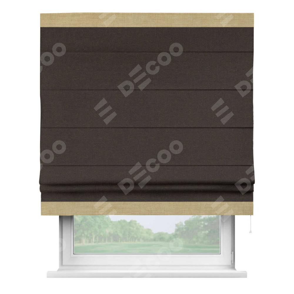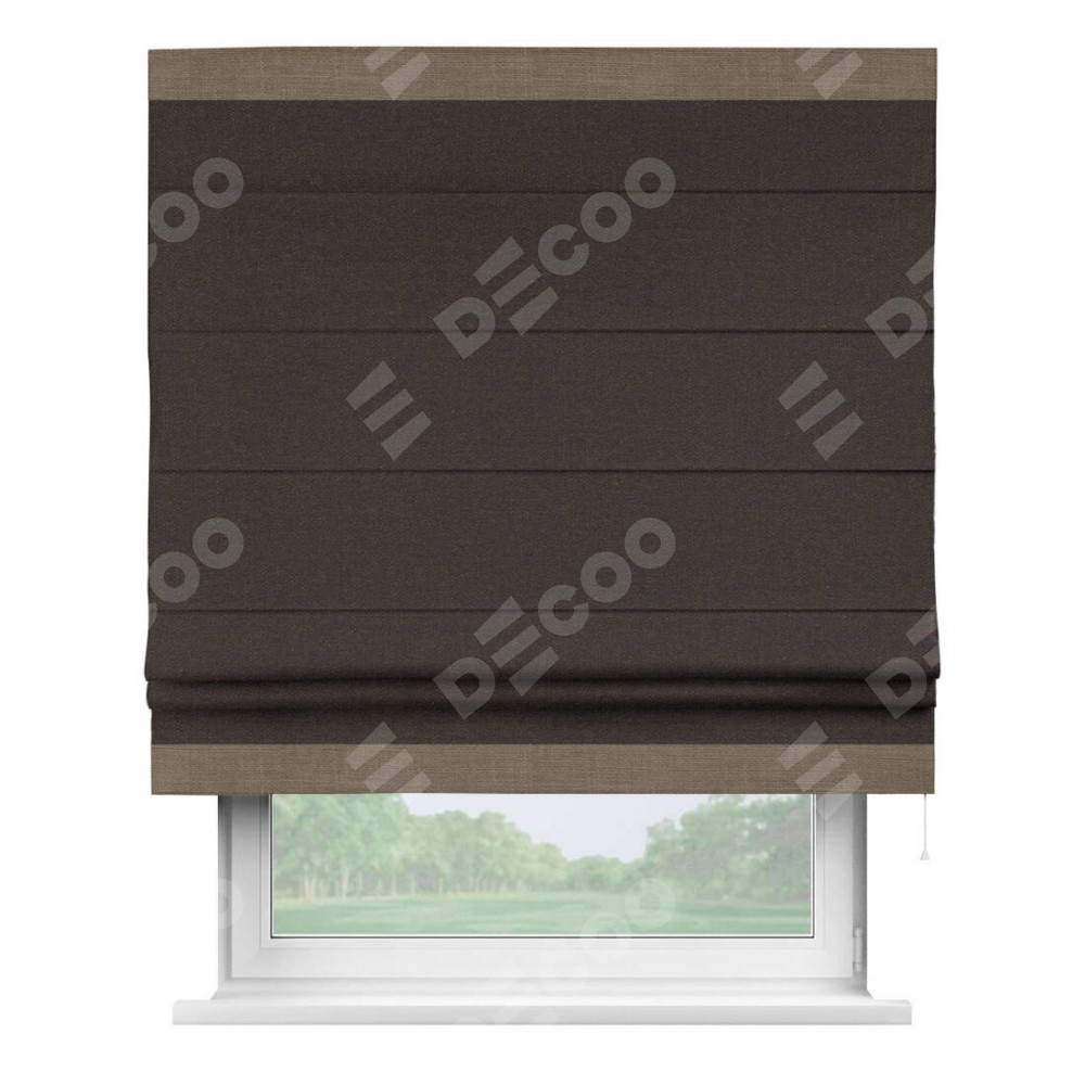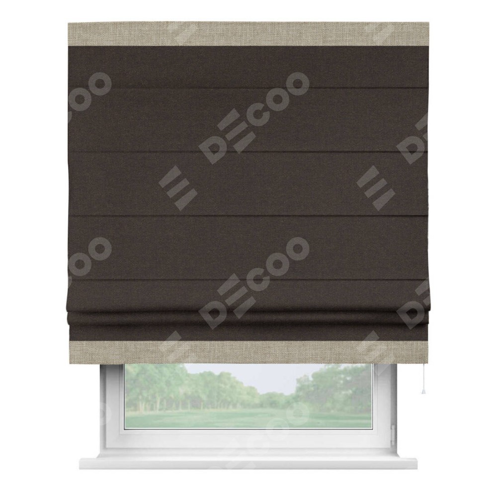 Классическая римская штора производителя «Cortin», пошита из ткани лён тёмно-коричневый, артикул: 104497. Имеет универсальный механизм и подходит для монтажа: на потолок, на стену и в нишу.