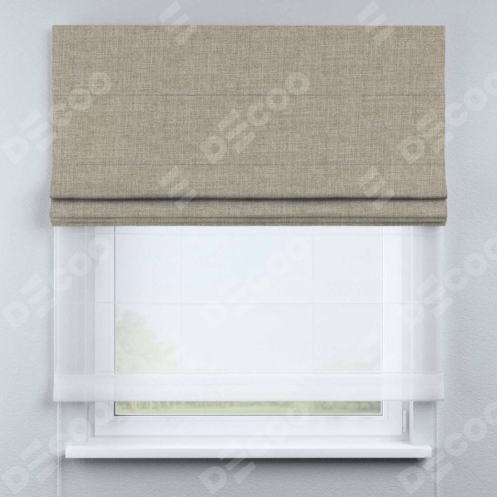 Двойная римская штора «День-ночь» от производителя Cortin предназначена для использования в проёмах. Эта штора уникальна тем, что состоит из двух полотен. На лицевой стороне находится лён бежевый (артикул: 143839), обеспечивающий эффективное затемнение. В комплект также входит вторая ткань — легкий белый тюль (артикул: V-01), который добавляет изящества и легкости оформлению окна. Кроме того, доступны и другие разновидности ткани тюль, выбор которых доступен по  ссылке .