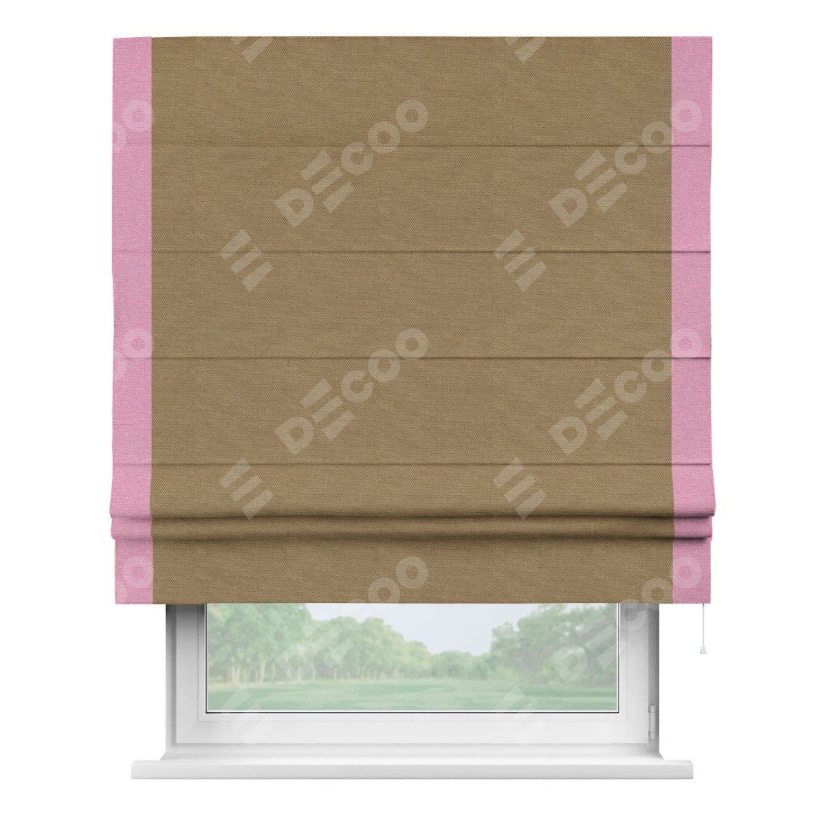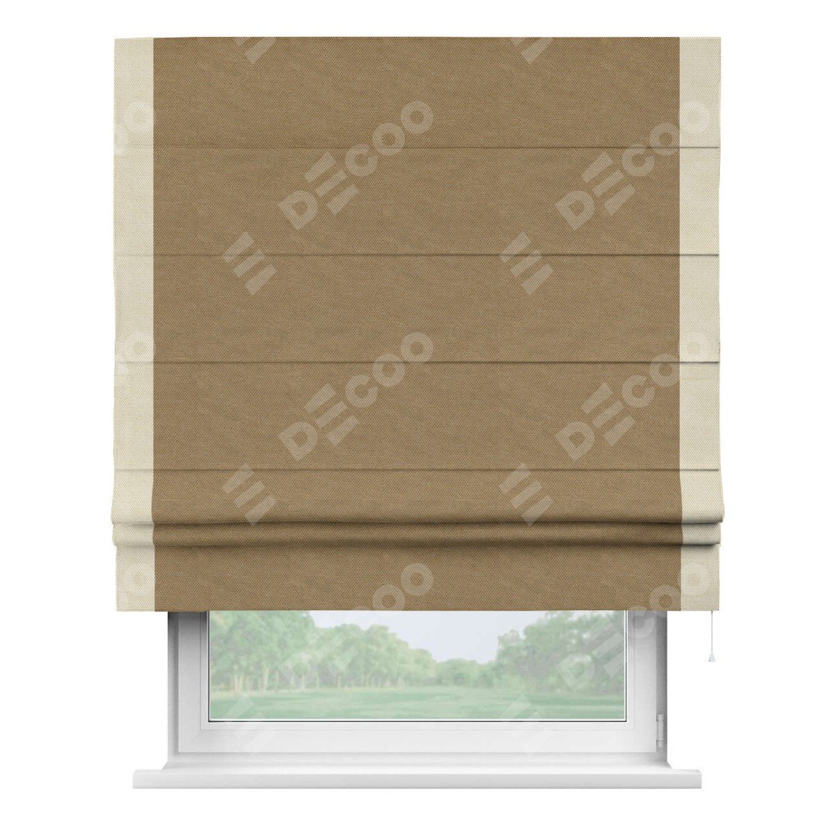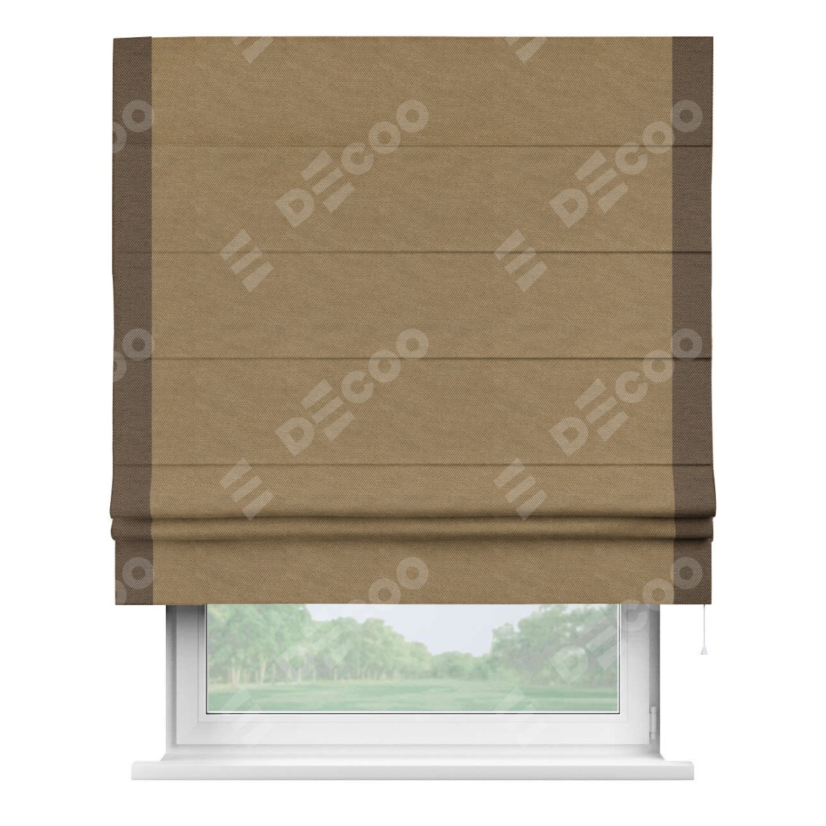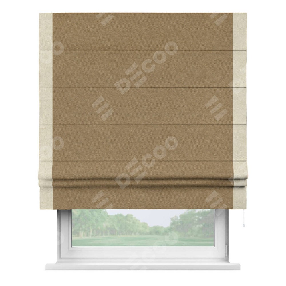 Римская штора производителя «Cortin», используется для проёма, пошита из ткани лён димаут коричневый, артикул 83026. Отделка шторы кантом «Стрим Дуо», ткань для канта используется из льна димаут разной расцветки на выбор. Имеет универсальный механизм и подходит для монтажа: на потолок, на стену и в нишу.