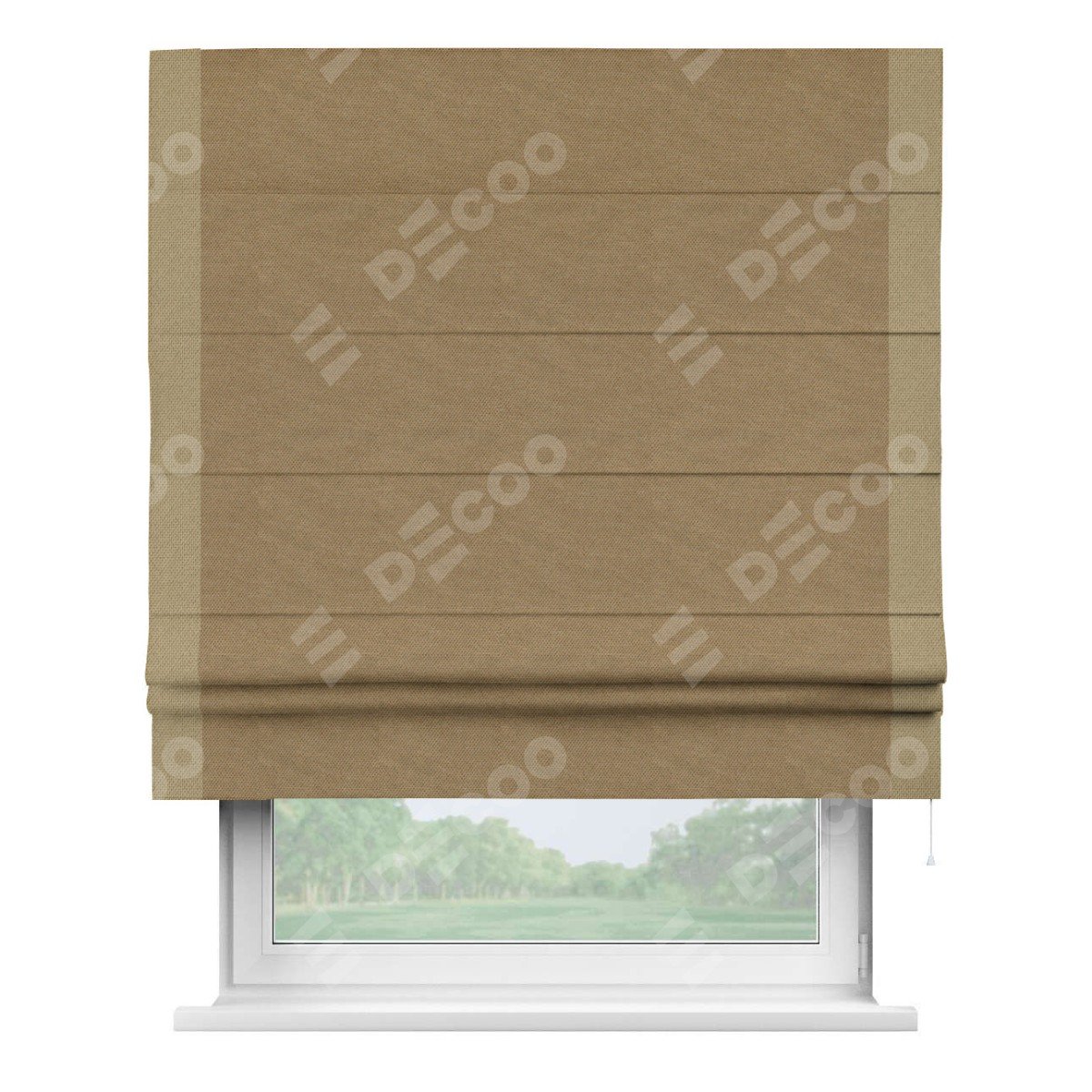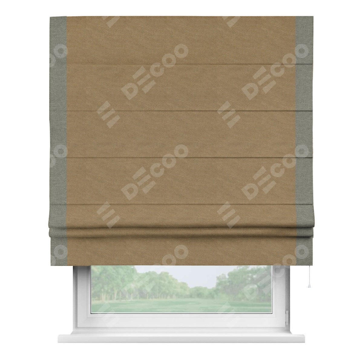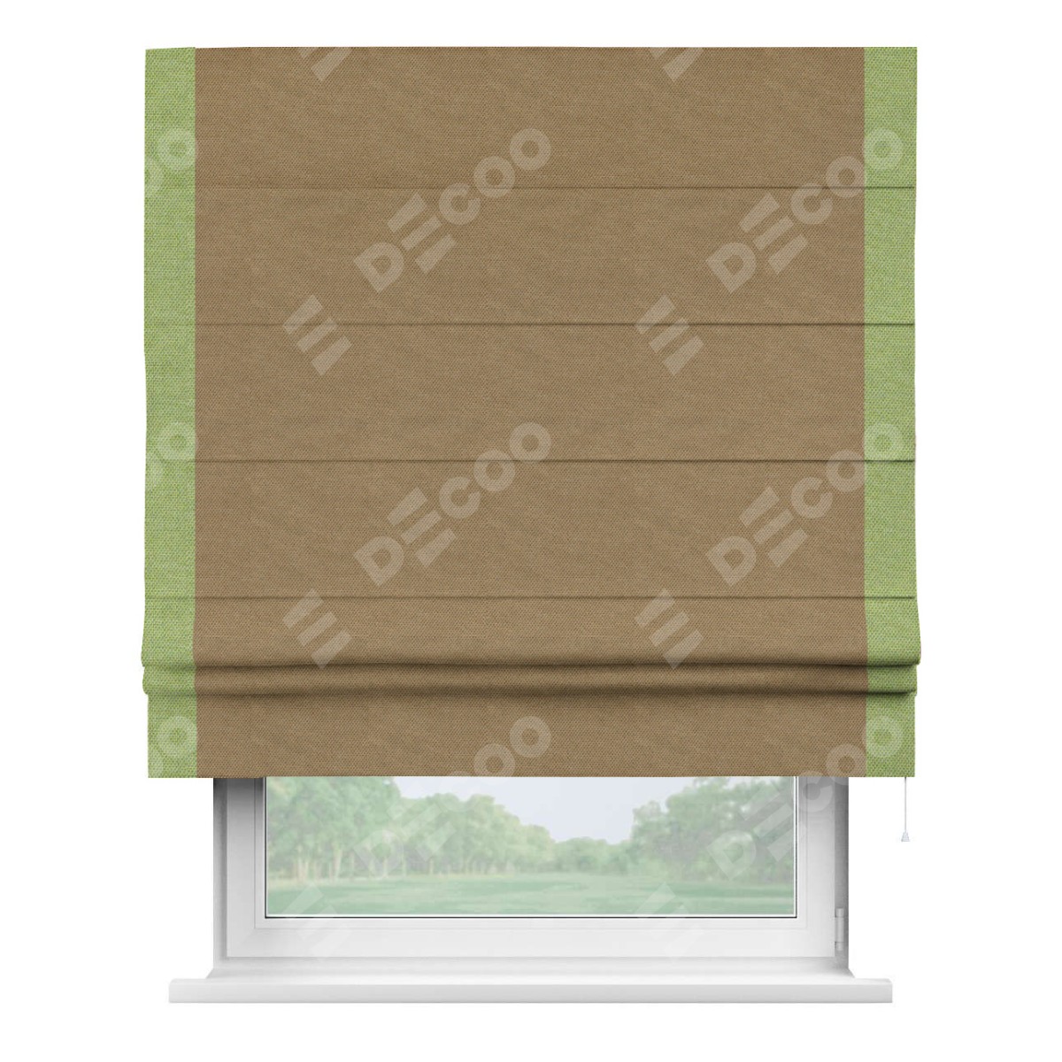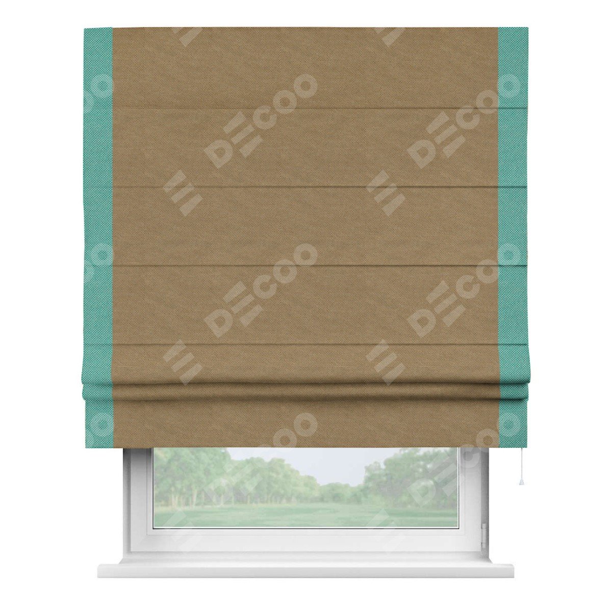 Римская штора производителя «Cortin», используется для проёма, пошита из ткани лён димаут коричневый, артикул 83026. Отделка шторы кантом «Стрим Дуо», ткань для канта используется из льна димаут разной расцветки на выбор. Имеет универсальный механизм и подходит для монтажа: на потолок, на стену и в нишу.