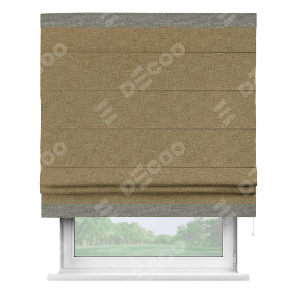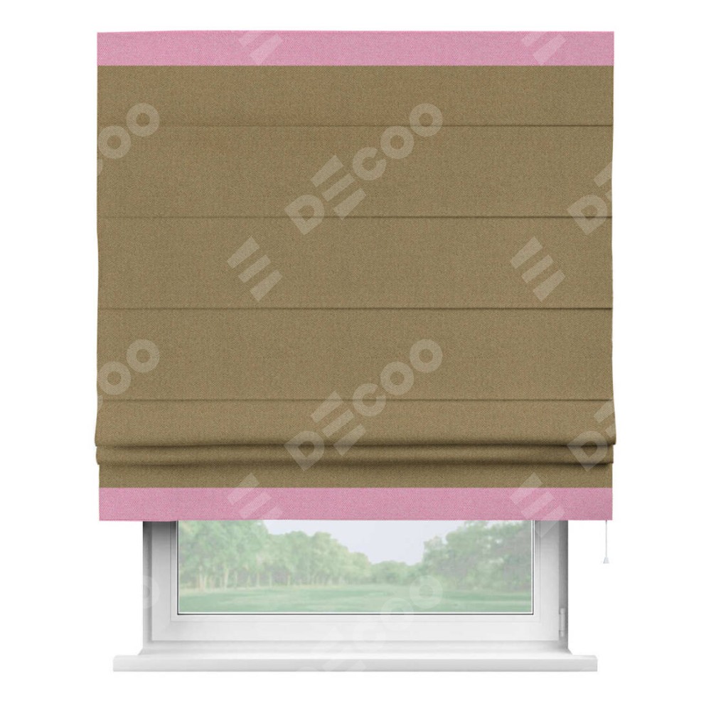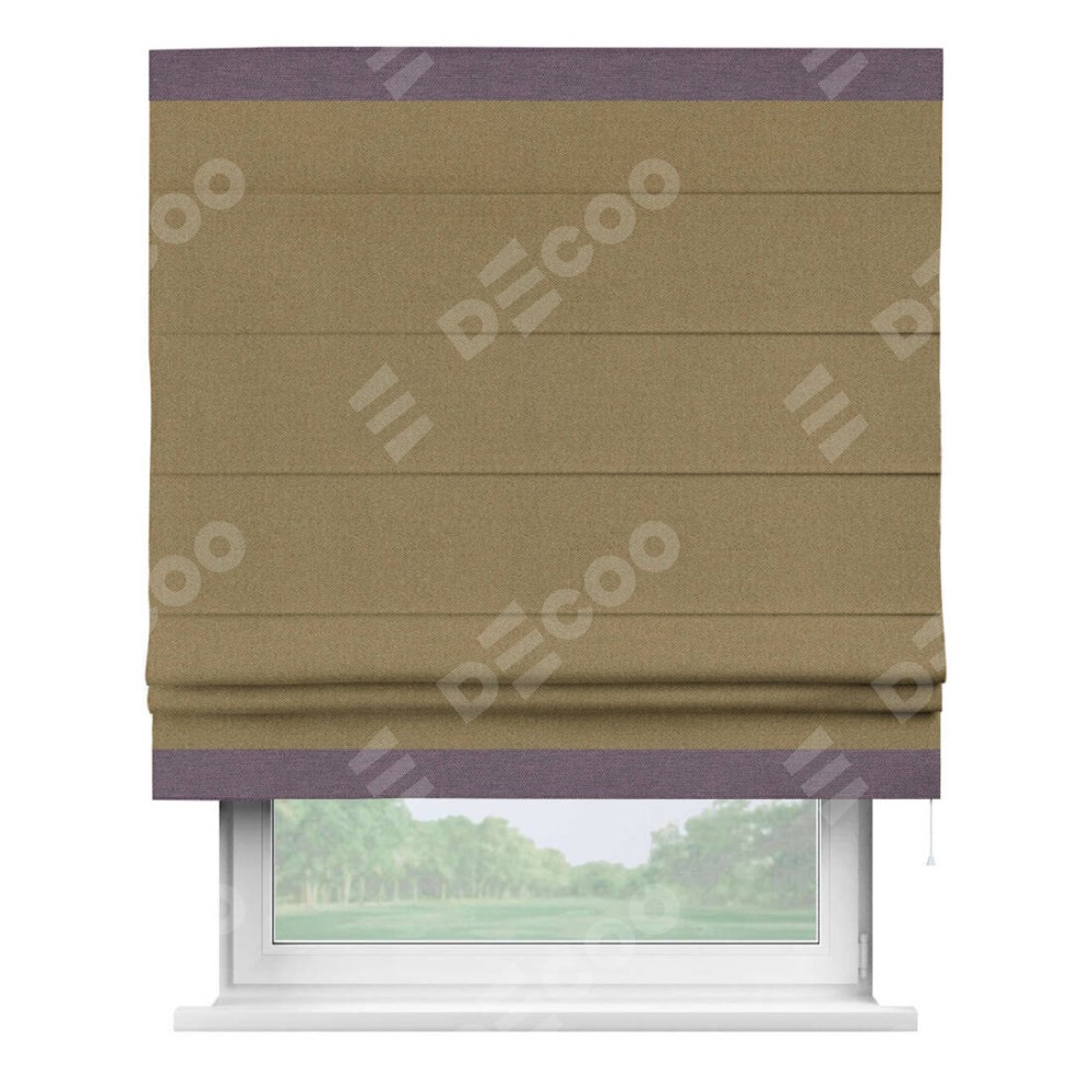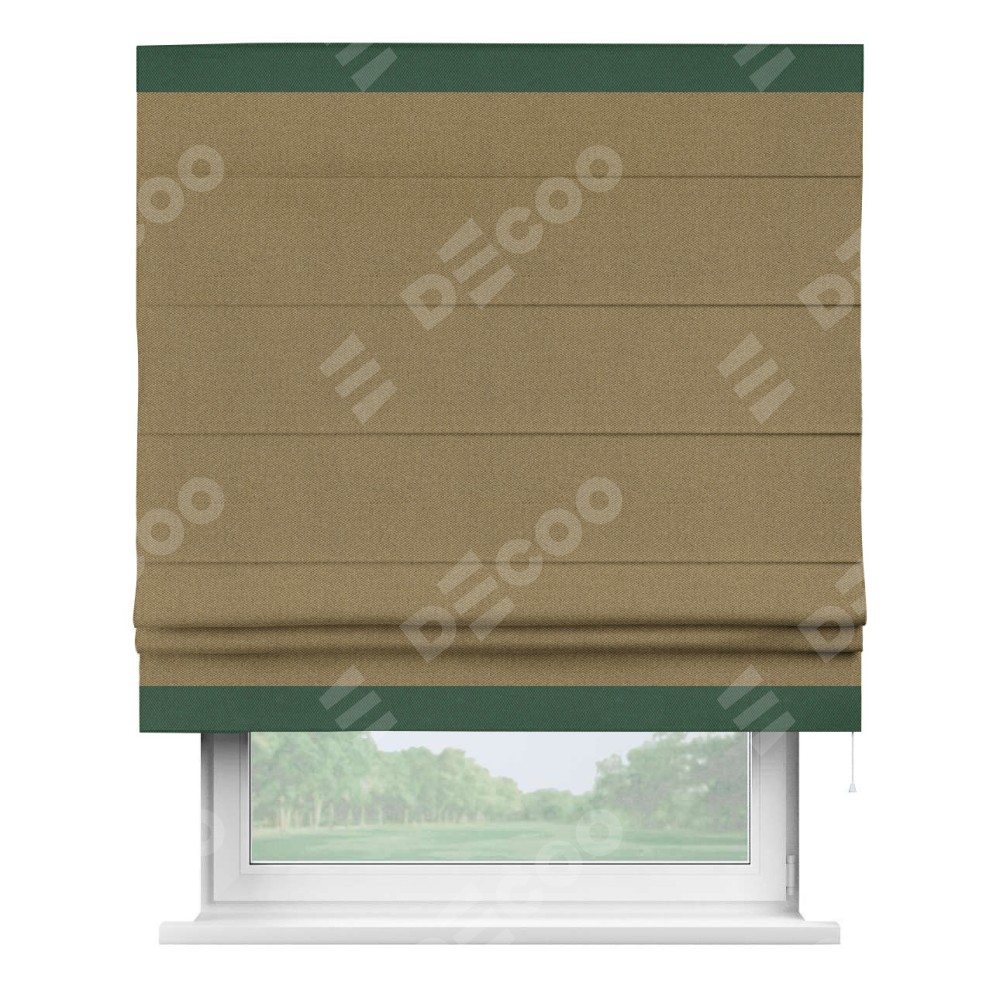 Римская штора производителя «Cortin», используется для проёма, пошита из ткани лён димаут оливковый, артикул 16243. Отделка шторы кантом «Горизонт», ткань для канта используется из льна димаут разной расцветки на выбор. Имеет универсальный механизм и подходит для монтажа: на потолок, на стену и в нишу.