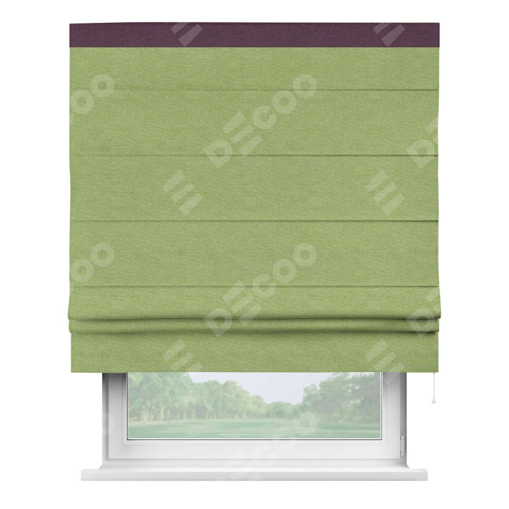 Римская штора производителя «Cortin», используется для проёма, пошита из ткани лён димаут салатовый, артикул 83032. Отделка шторы кантом «Кинг», ткань для канта используется из льна димаут разной расцветки на выбор. Имеет универсальный механизм и подходит для монтажа: на потолок, на стену и в нишу.