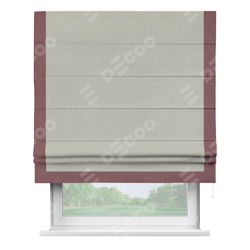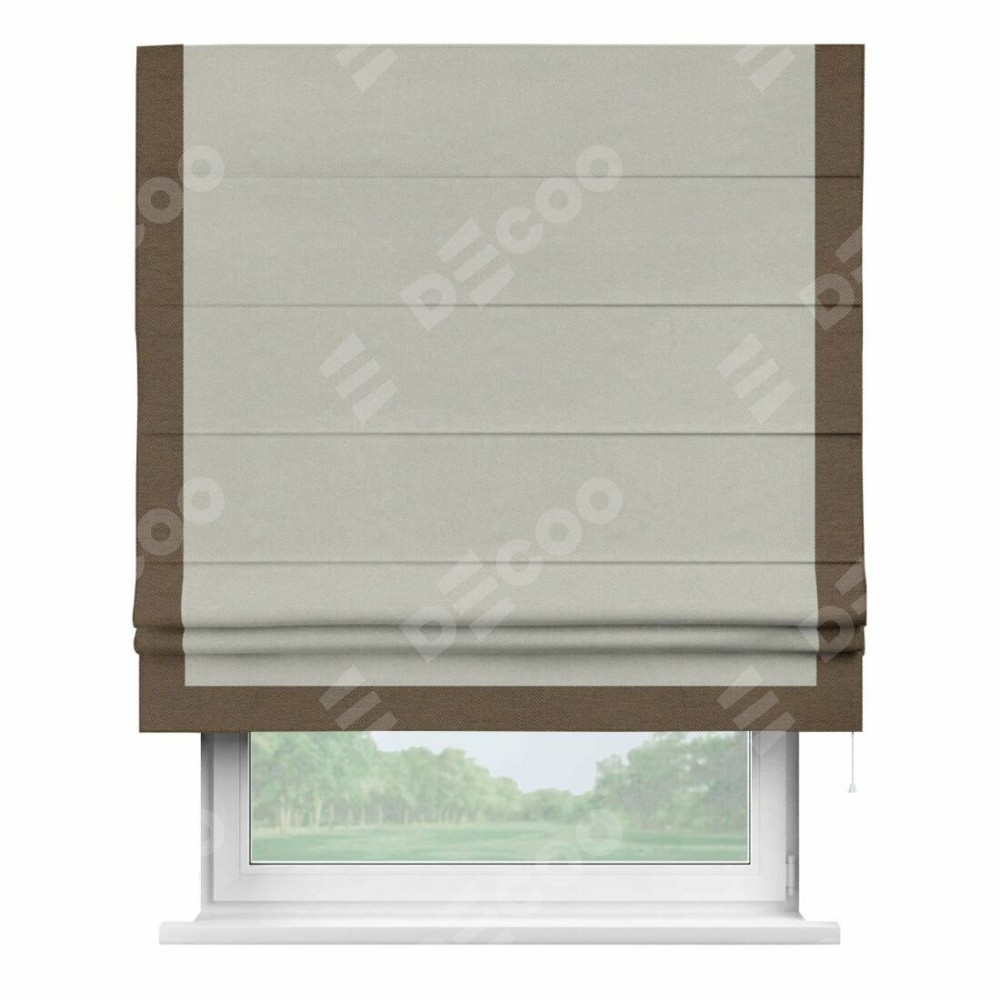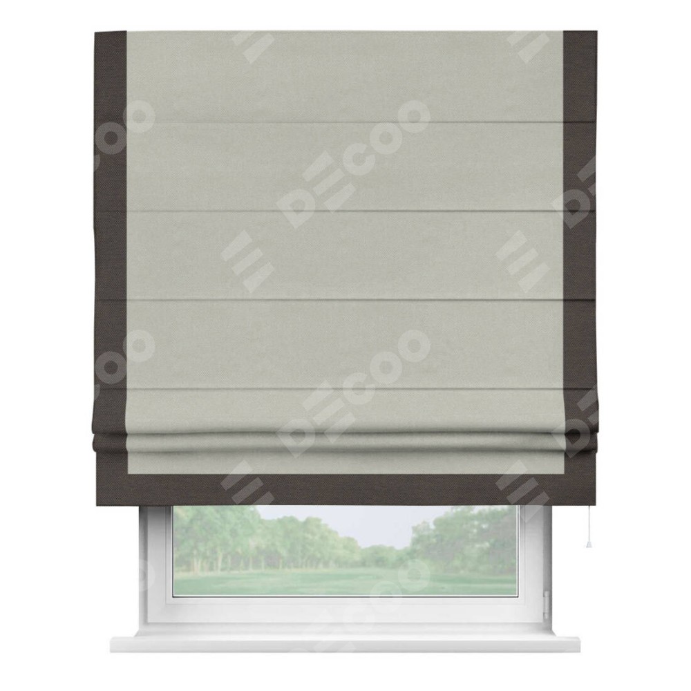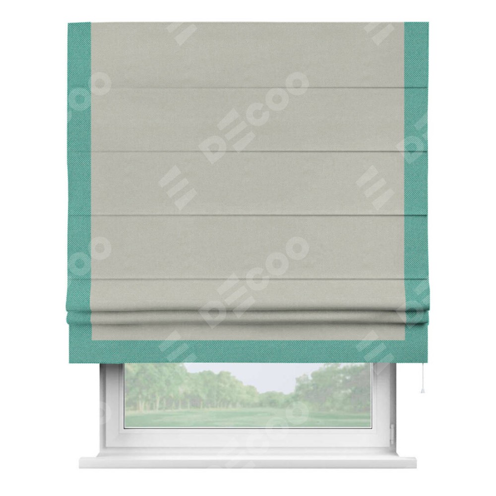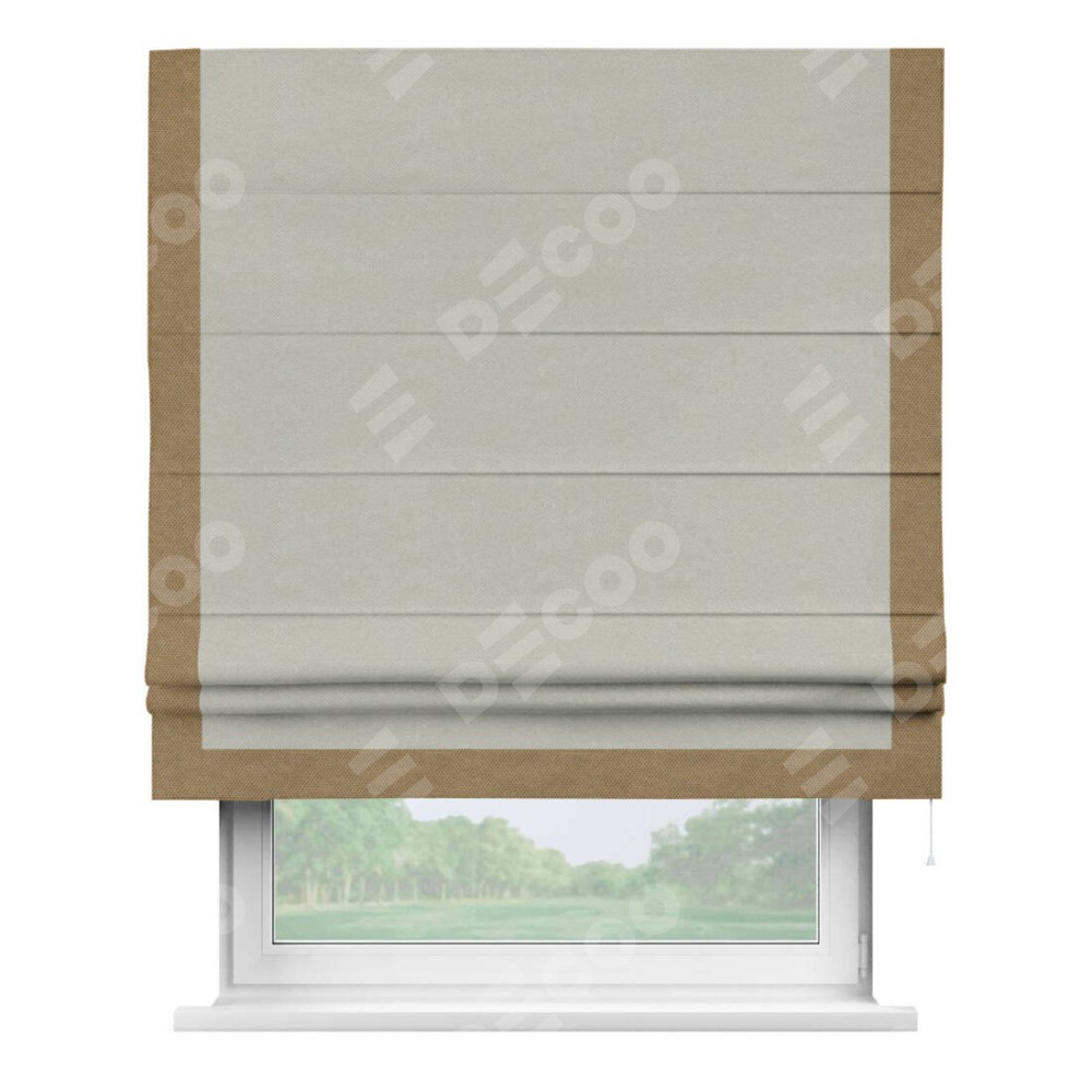 Римская штора производителя «Cortin», используется для проёма, пошита из ткани лён димаут светло-серый, артикул 83025. Отделка шторы кантом «Виктория», ткань для канта используется из льна димаут разной расцветки на выбор. Имеет универсальный механизм и подходит для монтажа: на потолок, на стену и в нишу.