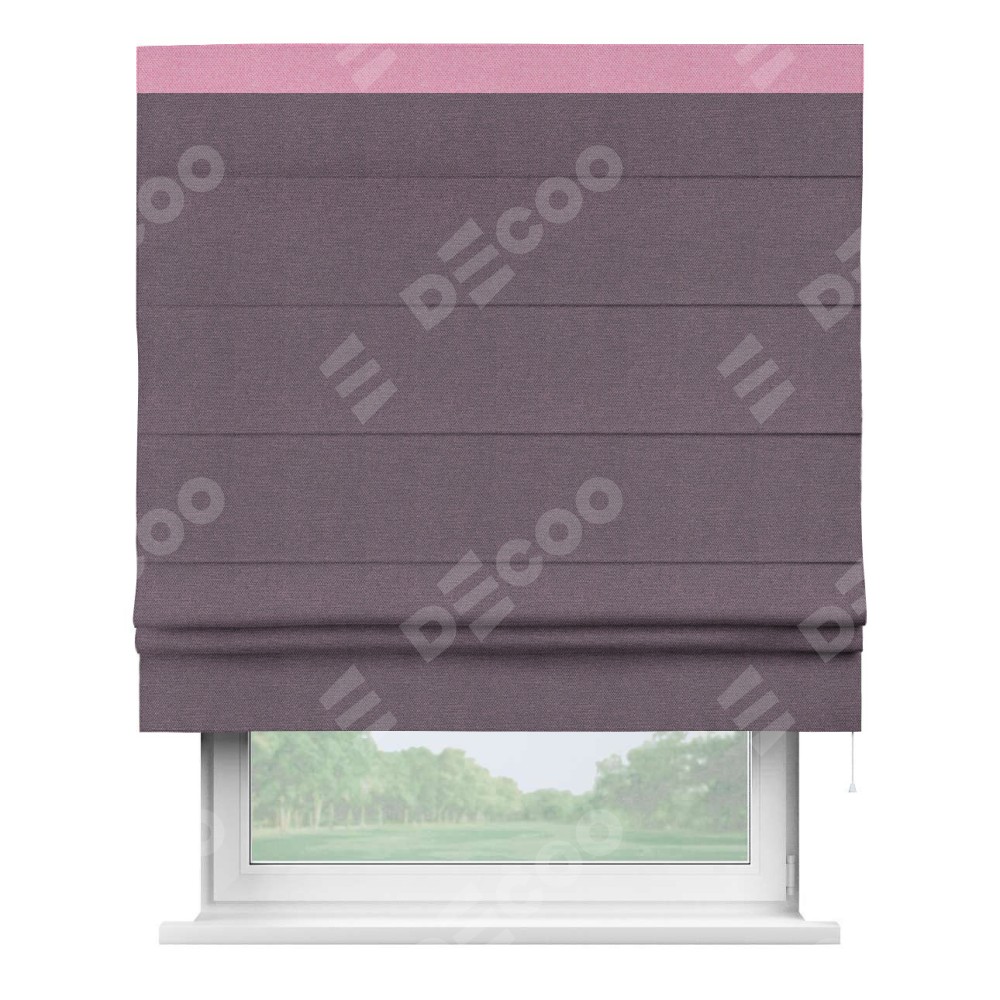 Римская штора производителя «Cortin», используется для проёма, пошита из ткани лён димаут светло-фиолетовый, артикул 83034. Отделка шторы кантом «Кинг», ткань для канта используется из льна димаут разной расцветки на выбор. Имеет универсальный механизм и подходит для монтажа: на потолок, на стену и в нишу.