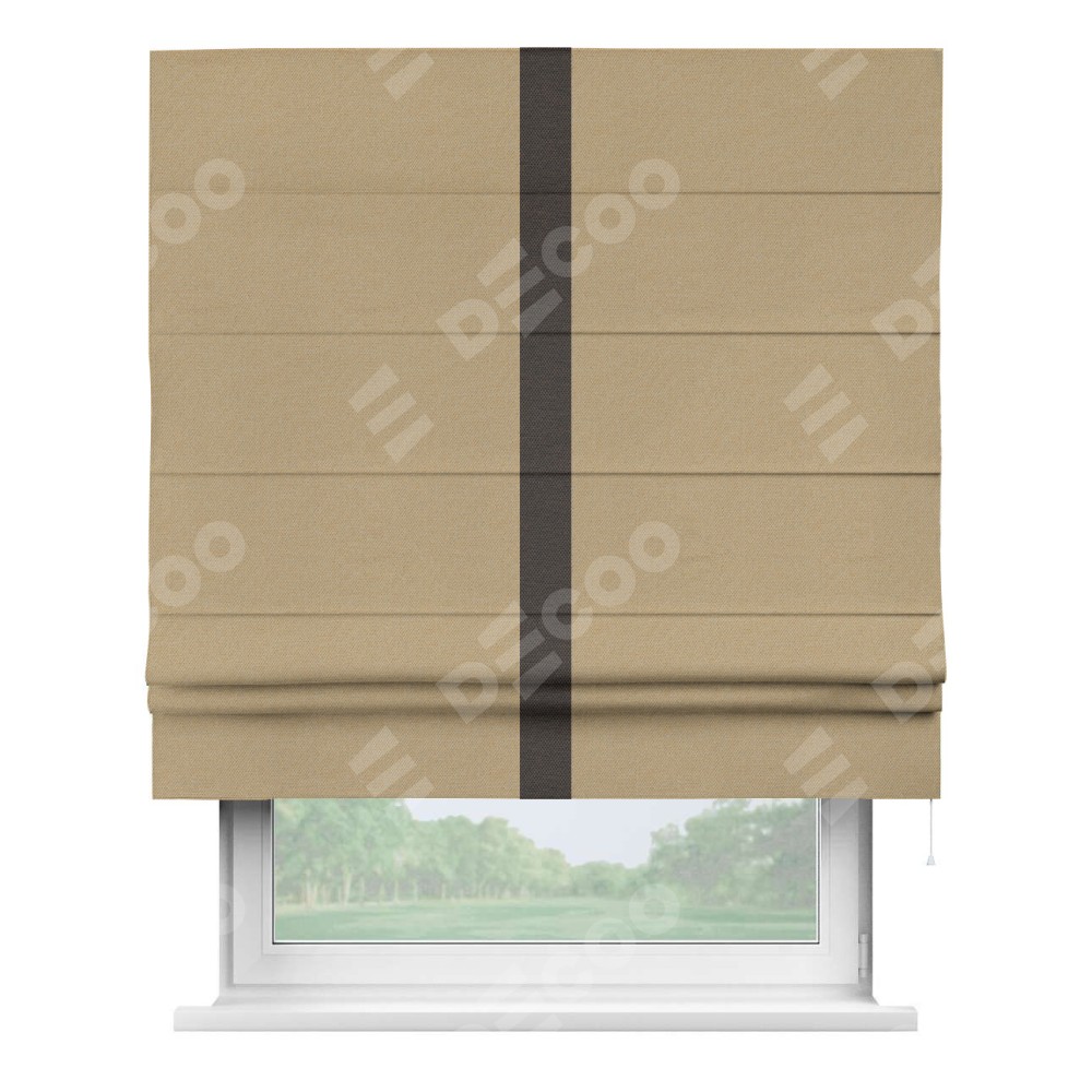 Римская штора производителя «Cortin», используется для проёма, пошита из ткани лён димаут тёмно-бежевый, артикул 83 037. Отделка шторы кантом «Хайвэй», ткань для канта используется из льна димаут разной расцветки на выбор. Имеет универсальный механизм и подходит для монтажа: на потолок, на стену и в нишу.
