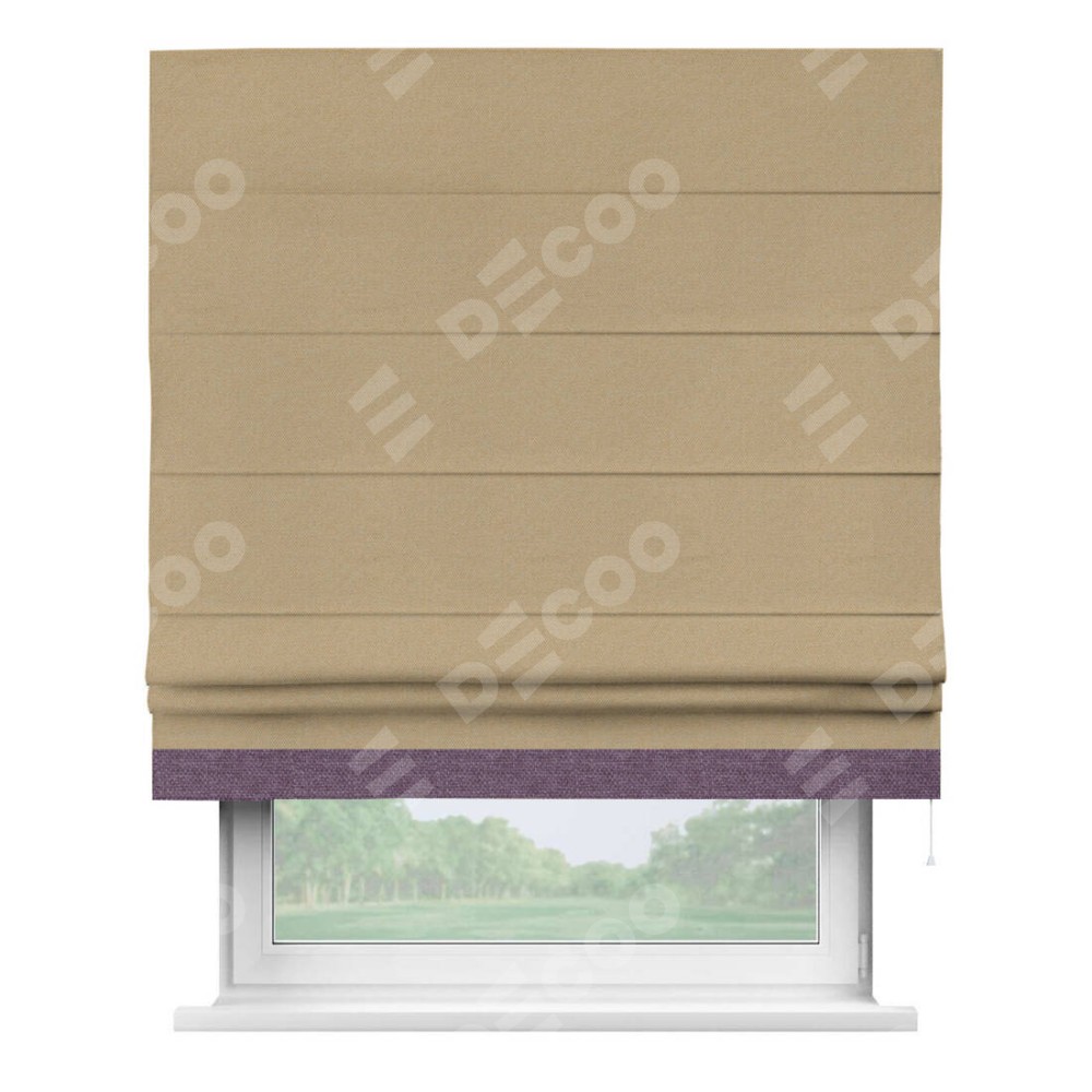 Римская штора производителя «Cortin», используется для проёма, пошита из ткани лён димаут тёмно-бежевый, артикул 83037. Отделка шторы кантом «Джестер», ткань для канта используется из льна димаут разной расцветки на выбор. Имеет универсальный механизм и подходит для монтажа: на потолок, на стену и в нишу.