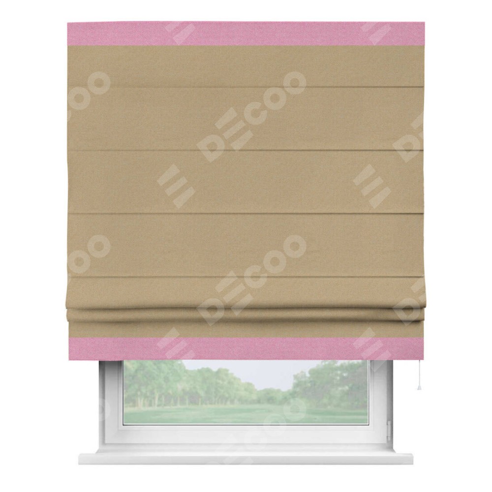 Римская штора производителя «Cortin», используется для проёма, пошита из ткани лён димаут тёмно-бежевый, артикул 83037. Отделка шторы кантом «Горизонт», ткань для канта используется из льна димаут разной расцветки на выбор. Имеет универсальный механизм и подходит для монтажа: на потолок, на стену и в нишу.