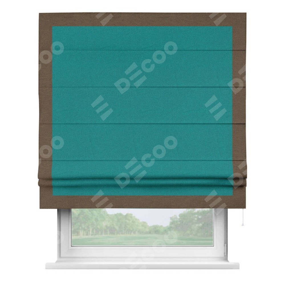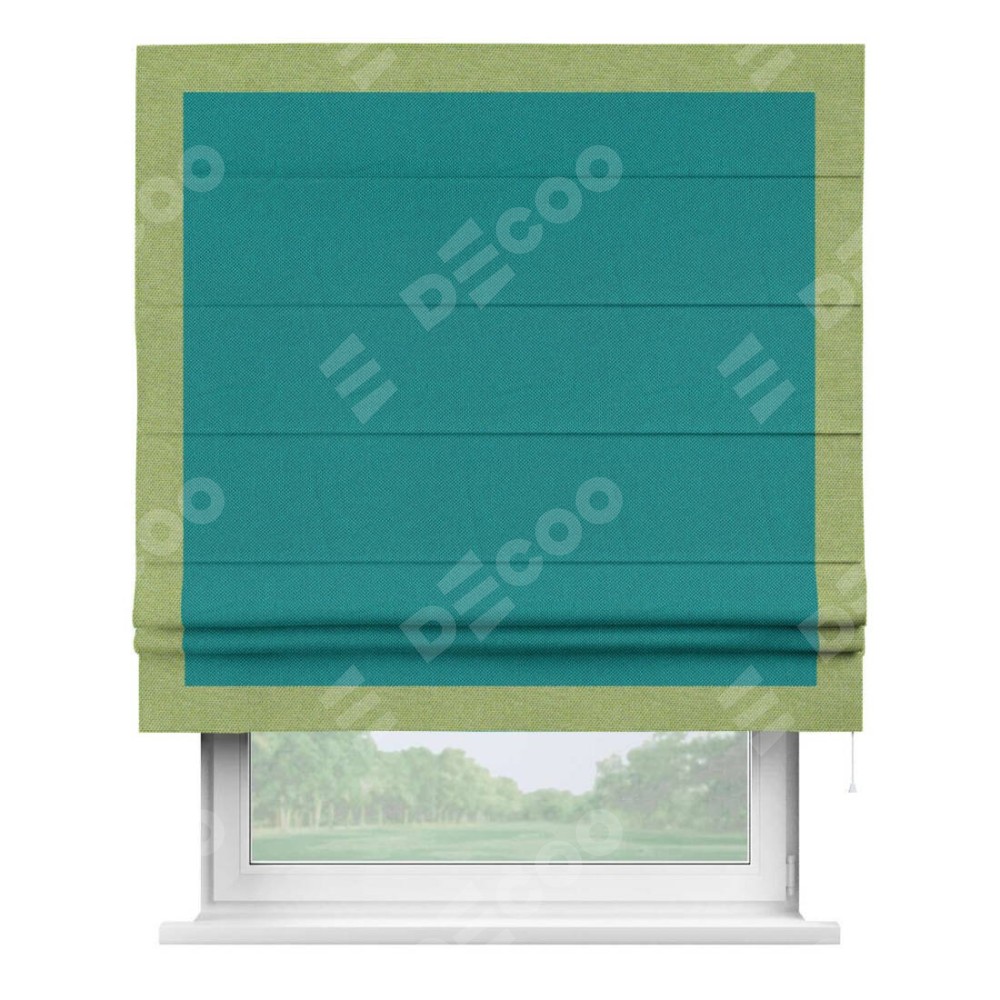 Римская штора производителя «Cortin», используется для проёма, пошита из ткани лён димаут тёмно-бирюзовый, артикул 318. Отделка шторы кантом «Чесс», ткань для канта используется из льна димаут разной расцветки на выбор. Имеет универсальный механизм и подходит для монтажа: на потолок, на стену и в нишу.
