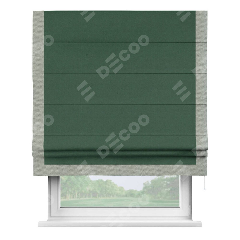 Римская штора производителя «Cortin», используется для проёма, пошита из ткани лён димаут тёмно-зелёный, артикул 16246. Отделка шторы кантом «Виктория», ткань для канта используется из льна димаут разной расцветки на выбор. Имеет универсальный механизм и подходит для монтажа: на потолок, на стену и в нишу.