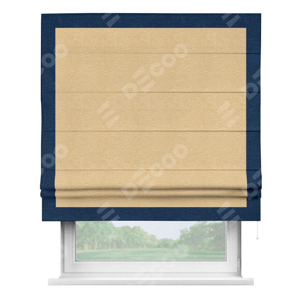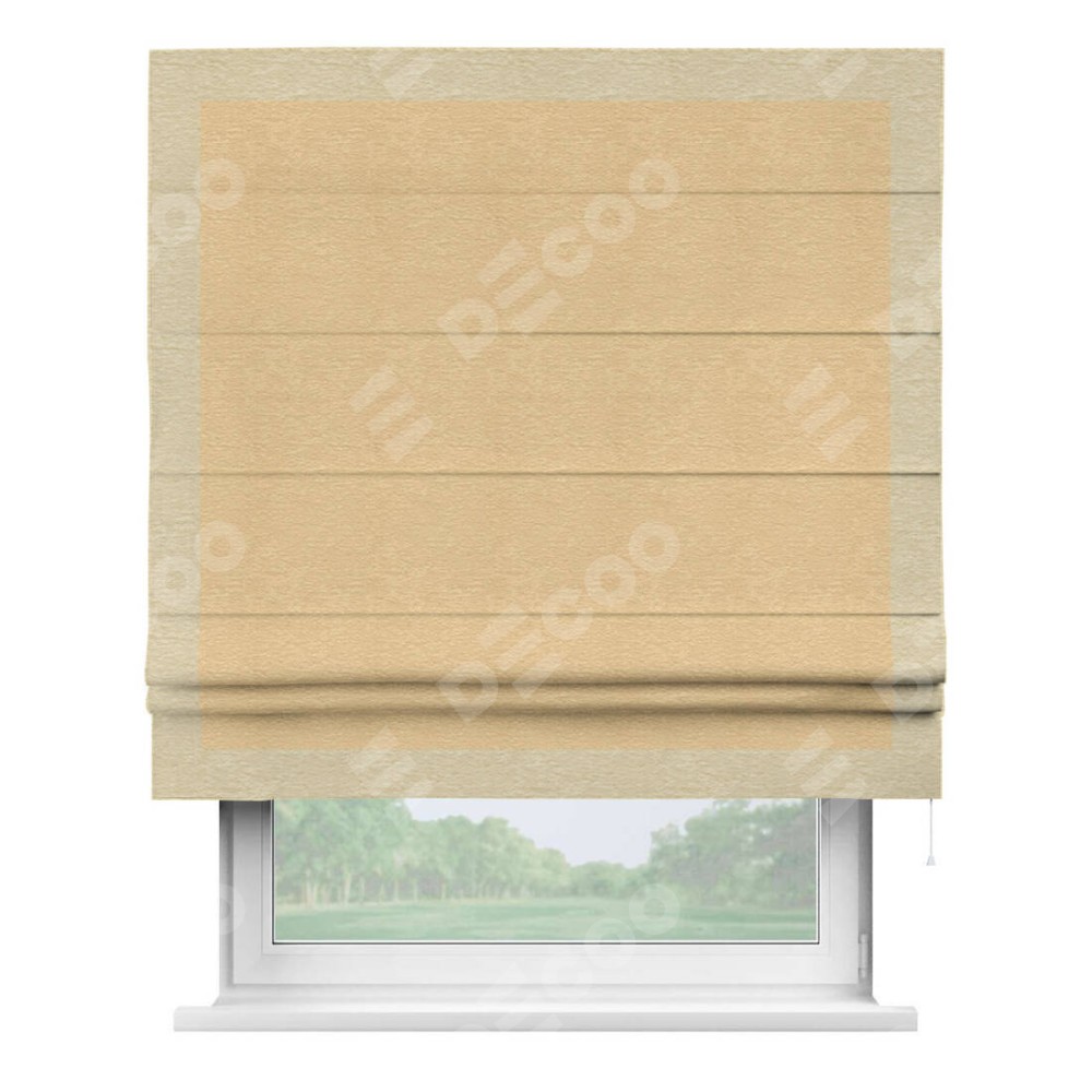 Римская штора производителя «Cortin», используется для проёма, пошита из ткани софт однотонный бежевый, артикул 4202 05. Отделка шторы кантом «Чесс», ткань для канта используется из софта разной расцветки на выбор. Имеет универсальный механизм и подходит для монтажа: на потолок, на стену и в нишу.