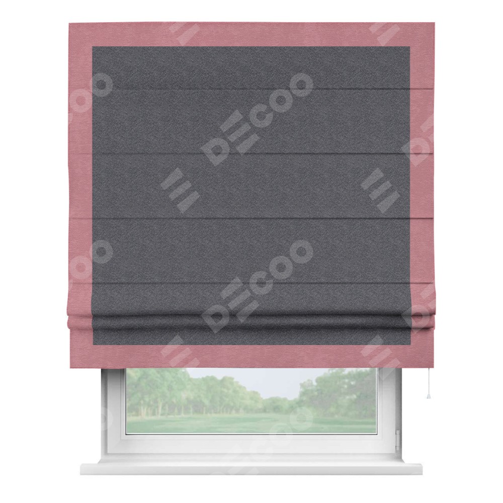 Римская штора производителя «Cortin», используется для проёма, пошита из ткани софт однотонный графит, артикул 19316. Отделка шторы кантом «Чесс», ткань для канта используется из софта разной расцветки на выбор. Имеет универсальный механизм и подходит для монтажа: на потолок, на стену и в нишу.
