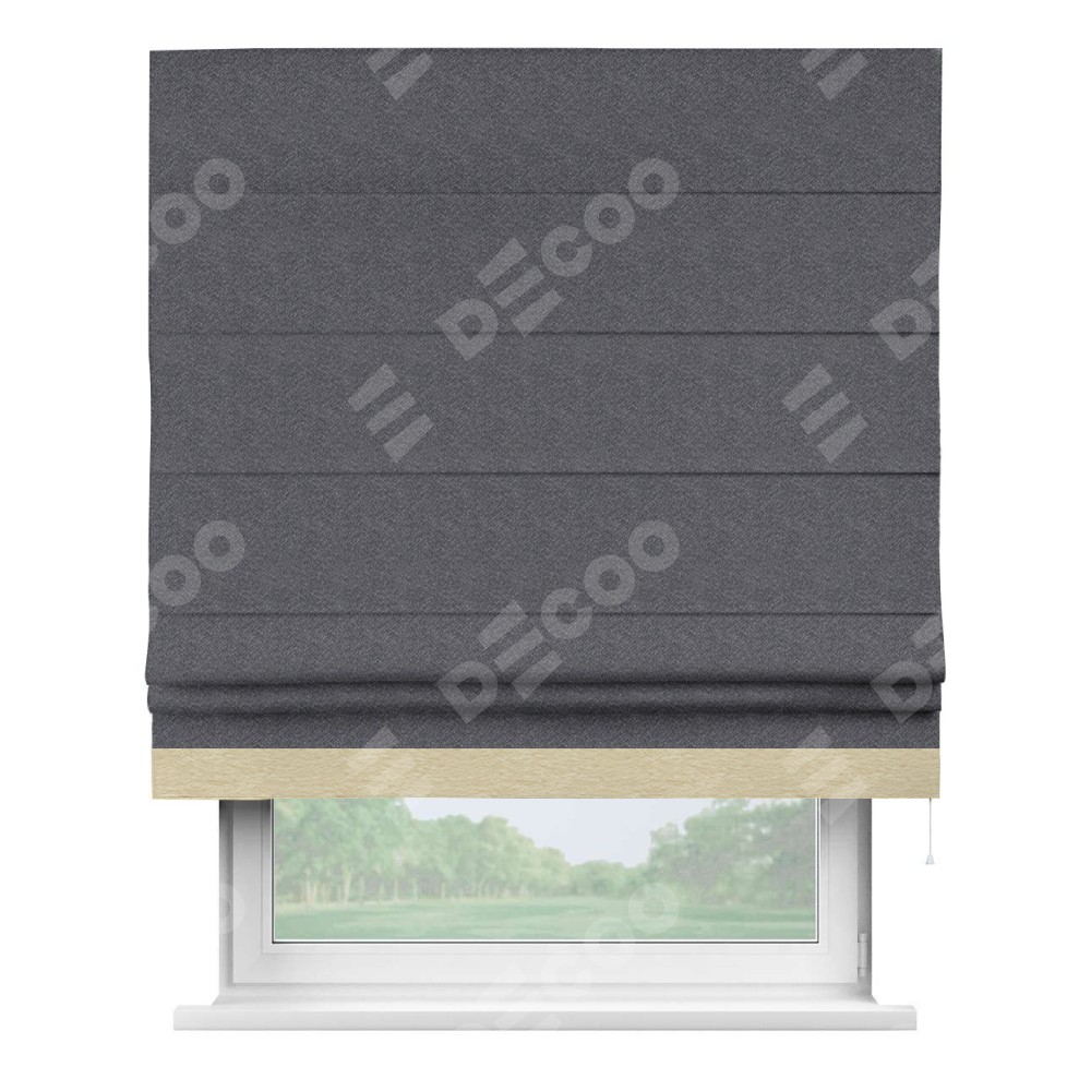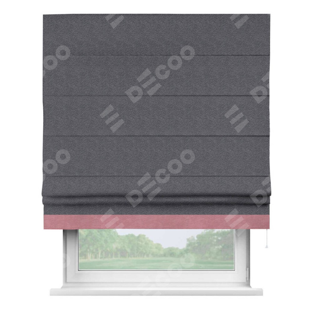 Римская штора производителя «Cortin», используется для проёма, пошита из ткани софт однотонный графит, артикул 19316. Отделка шторы кантом «Джестер», ткань для канта используется из софта разной расцветки на выбор. Имеет универсальный механизм и подходит для монтажа: на потолок, на стену и в нишу.