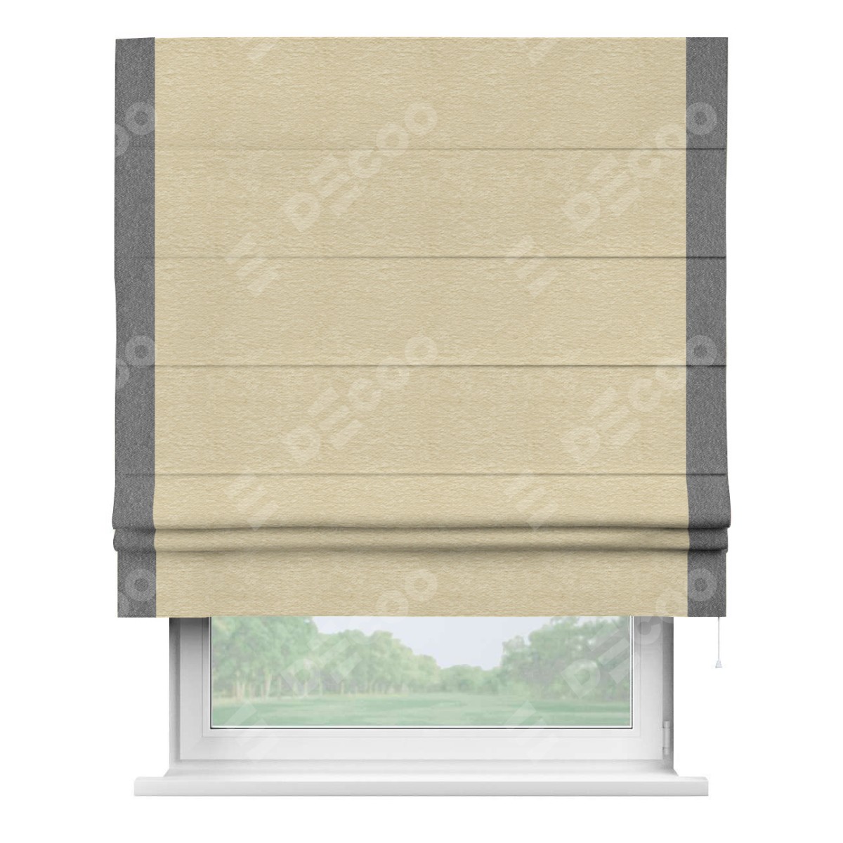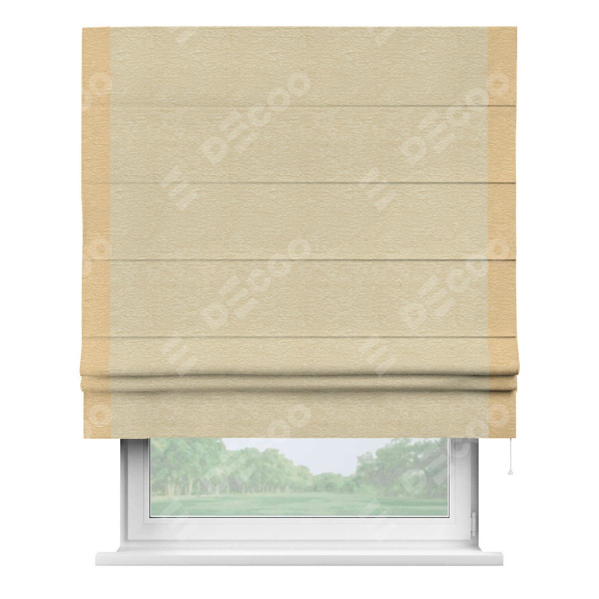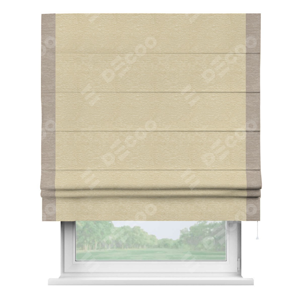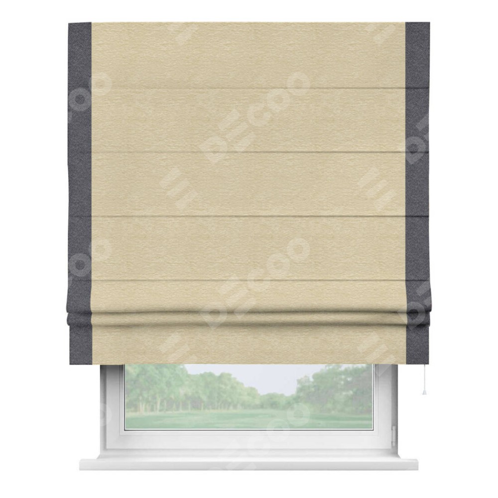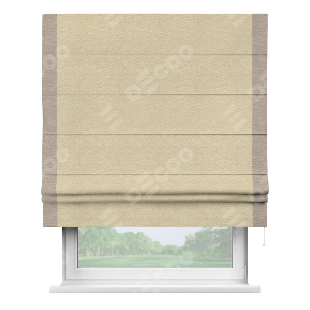Римская штора производителя «Cortin», используется для проёма, пошита из ткани софт однотонный светло-бежевый, артикул 54426. Отделка шторы кантом «Стрим Дуо», ткань для канта используется из софта разной расцветки на выбор. Имеет универсальный механизм и подходит для монтажа: на потолок, на стену и в нишу.