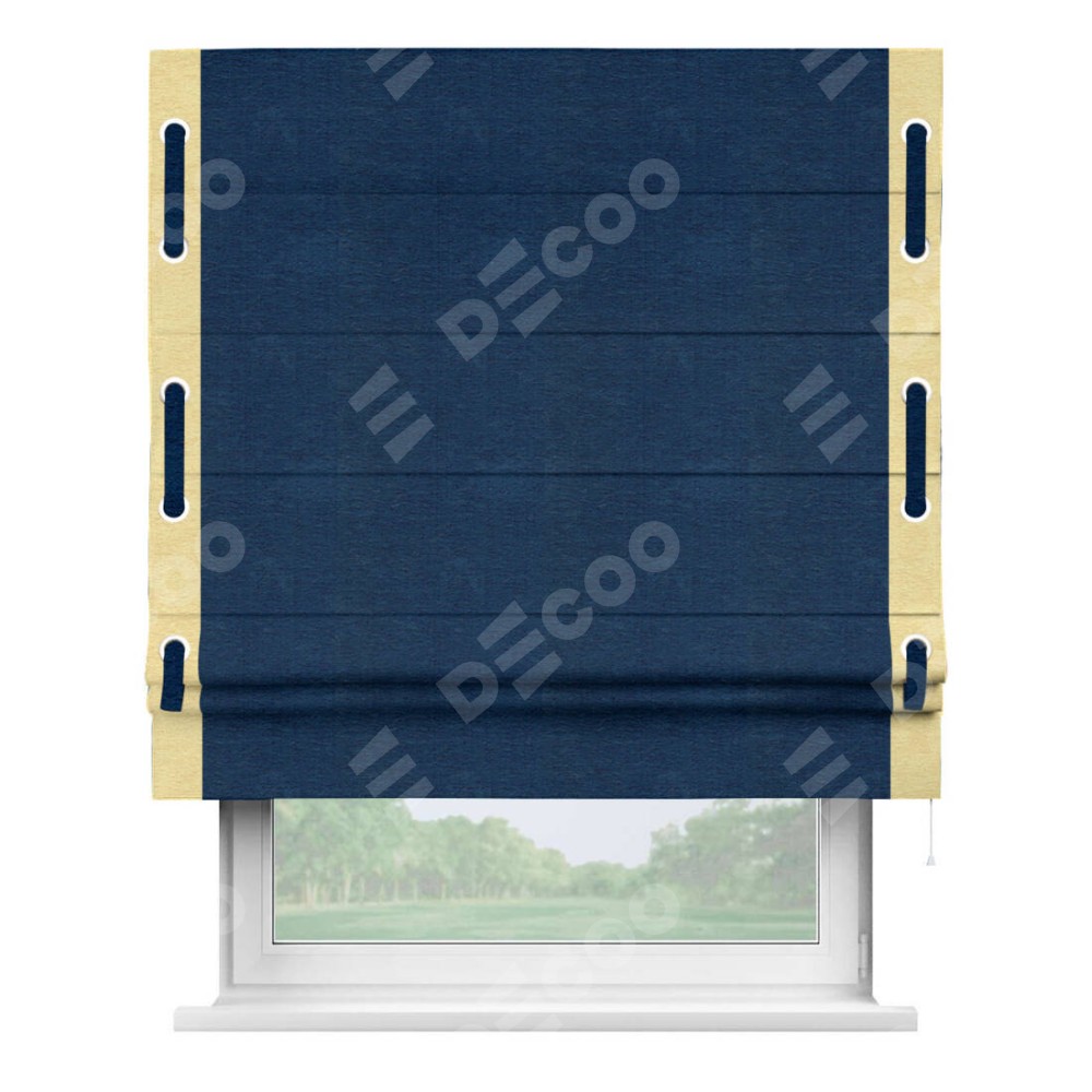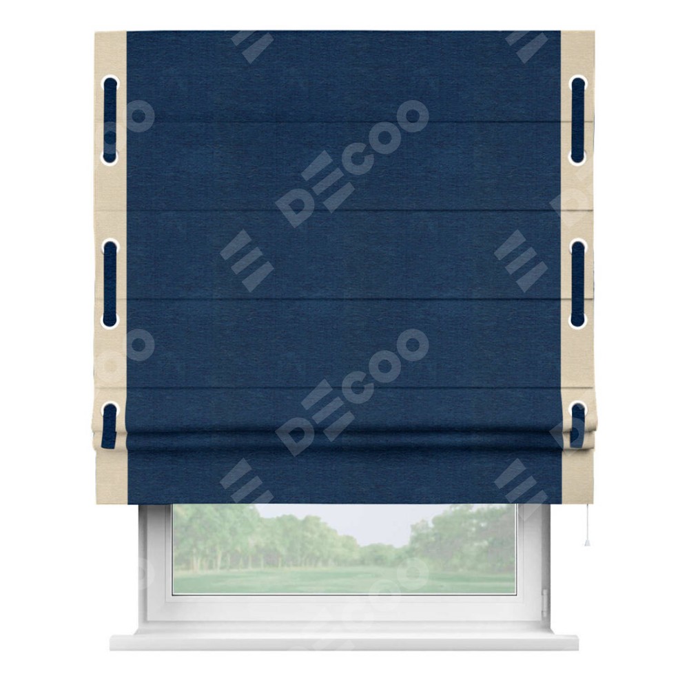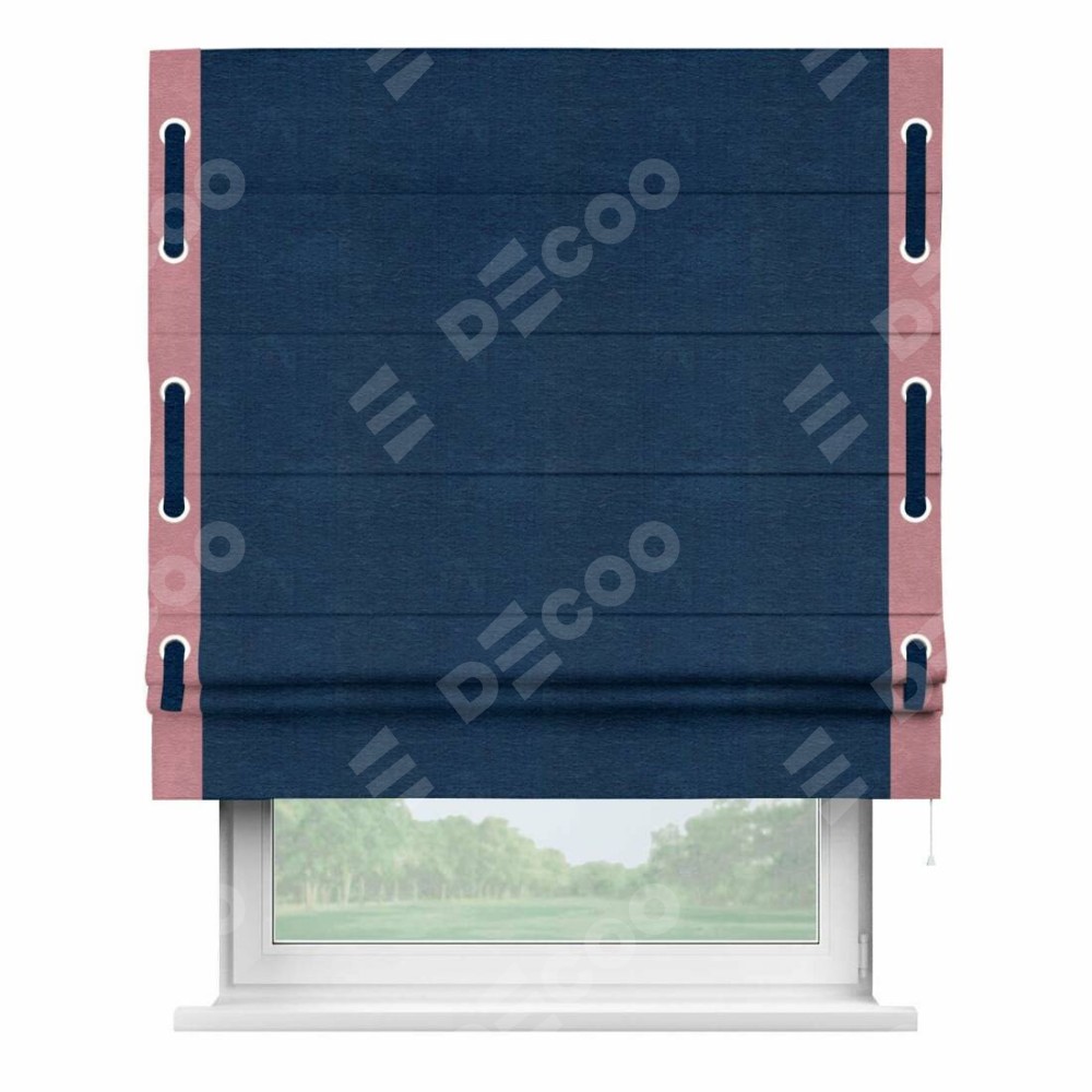 Римская штора производителя «Cortin», используется для проёма, пошита из ткани софт однотонный синий, артикул 42937. Отделка шторы кантом «Стрим Дуо» на кантах расположены люверсы с пояском, ткань для канта используется из софта разной расцветки на выбор. Ткань для пояска обычно используется из основной ткани шторы, а так же можно сделать из любой расцветки по желанию. Имеет универсальный механизм и подходит для монтажа: на потолок, на стену и в нишу.