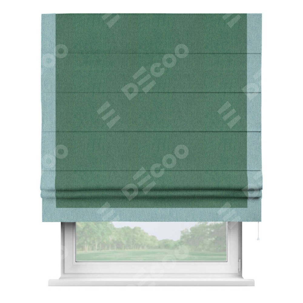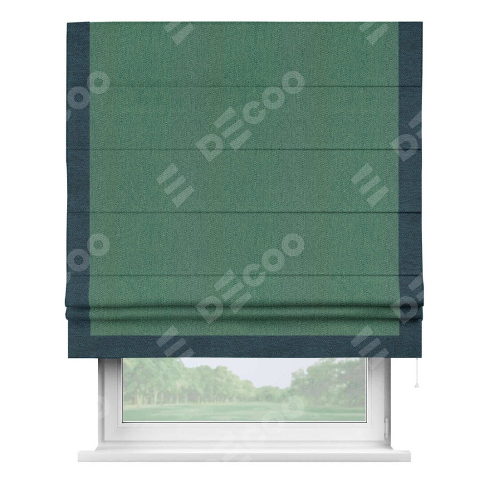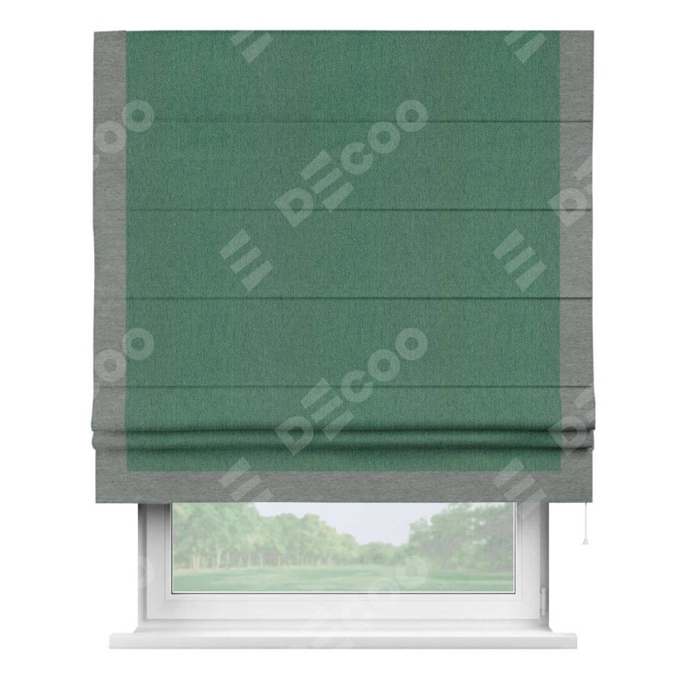 Римская штора производителя «Cortin», используется для проёма, пошита из ткани твид блэкаут зелёный, артикул 21589. Отделка шторы кантом «Виктория», ткань для канта используется из твида разной расцветки на выбор. Имеет универсальный механизм и подходит для монтажа: на потолок, на стену и в нишу.