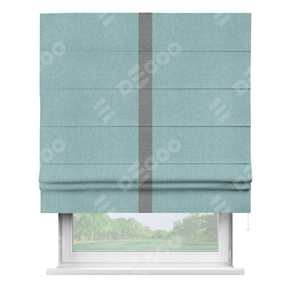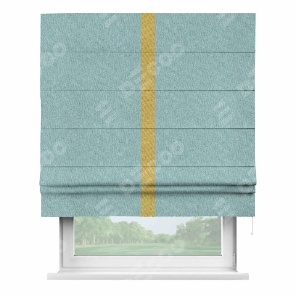 Римская штора производителя «Cortin», используется для проёма, пошита из ткани твид блэкаут небесно-голубой, артикул 21578. Отделка шторы кантом «Хайвэй», ткань для канта используется из твида разной расцветки на выбор. Имеет универсальный механизм и подходит для монтажа: на потолок, на стену и в нишу.