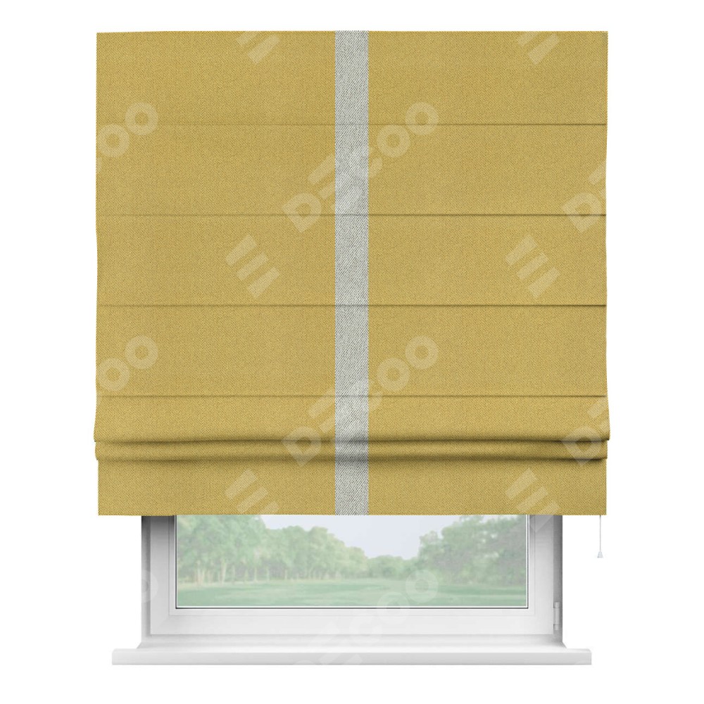Римская штора производителя «Cortin», используется для проёма, пошита из ткани твид блэкаут пыльная горчица, артикул 21588. Отделка шторы кантом «Хайвэй», ткань для канта используется из твида разной расцветки на выбор. Имеет универсальный механизм и подходит для монтажа: на потолок, на стену и в нишу.