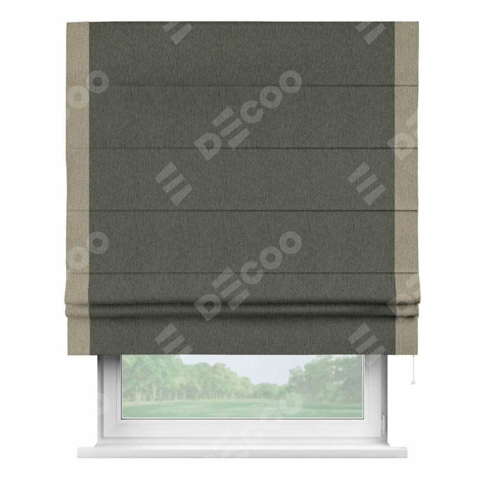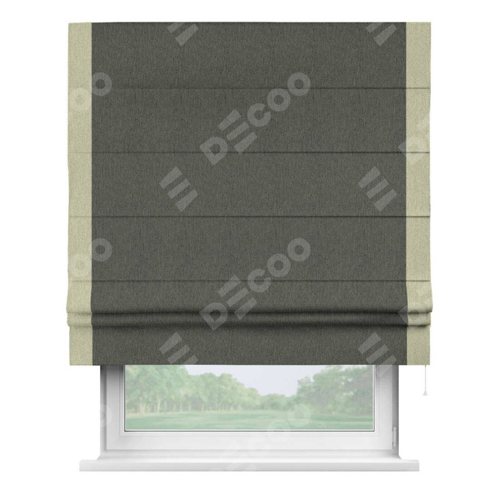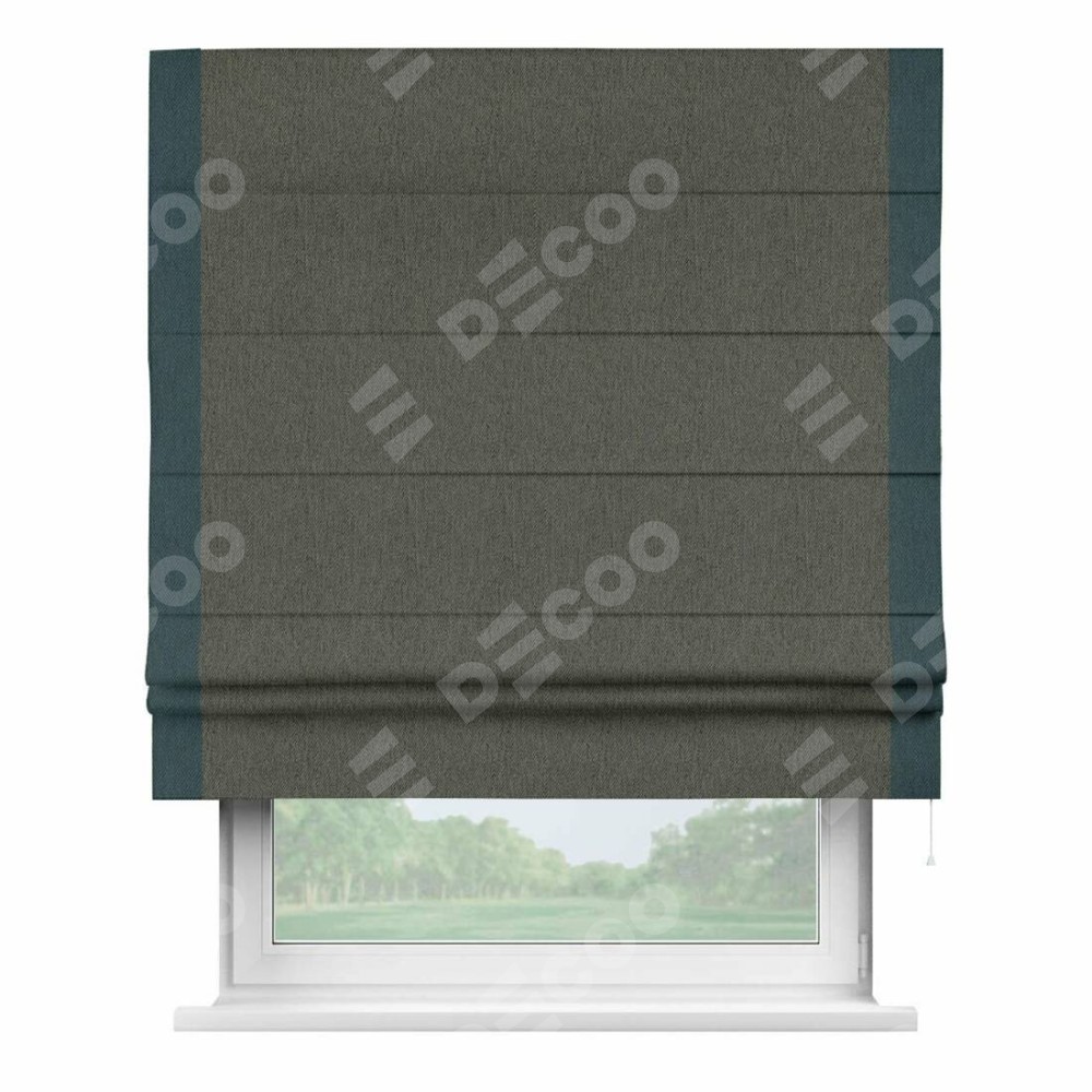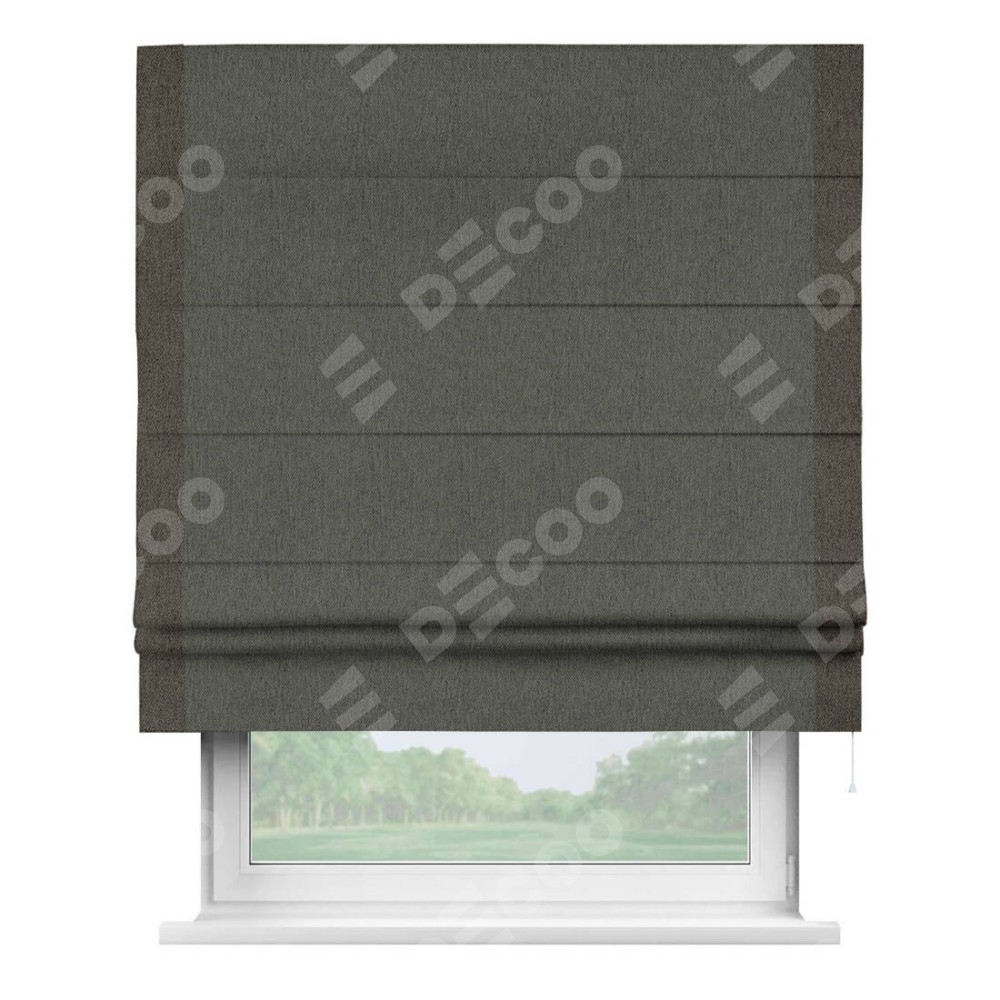 Римская штора производителя «Cortin», используется для проёма, пошита из ткани твид блэкаут тёмно-серый, артикул 21587. Отделка шторы кантом «Стрим Дуо», ткань для канта используется из твида разной расцветки на выбор. Имеет универсальный механизм и подходит для монтажа: на потолок, на стену и в нишу.