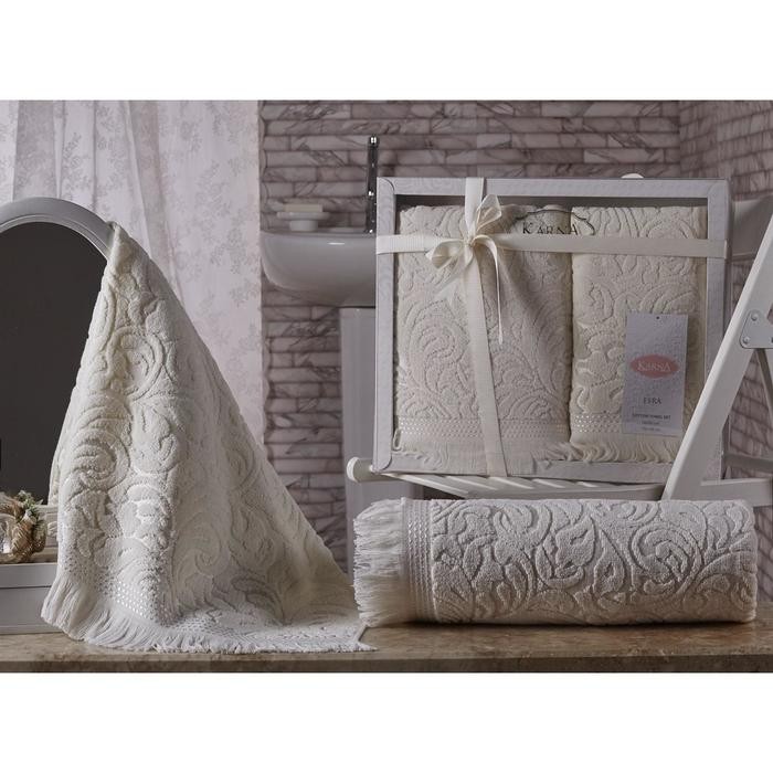 Комплект состоит из 2 полотенец (50×90 и 70×140), украшенных роскошной жаккардовой вышивкой и упакованных в красивую подарочную коробку.