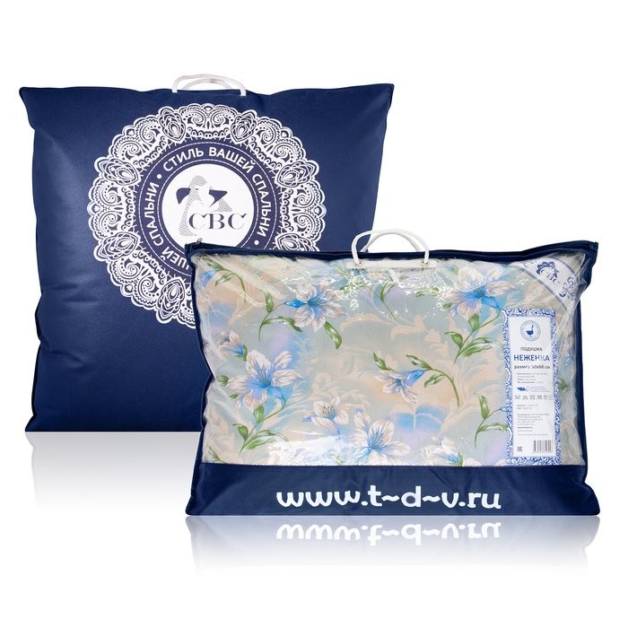 Подушка прочна, гигроскопична и воздухопроницаема. Ткань верха: пуходержащий набивной тик (хлопок, 100%); наполнитель: 40% — пух и 60% — перо водоплавающей птицы; атласная этикетка-уголок с логотипом «СВС» на сатине, кант.